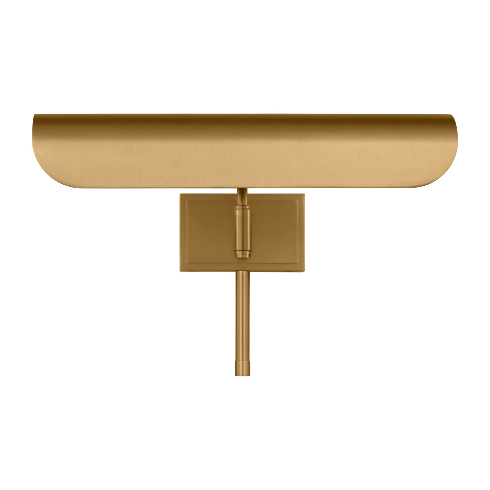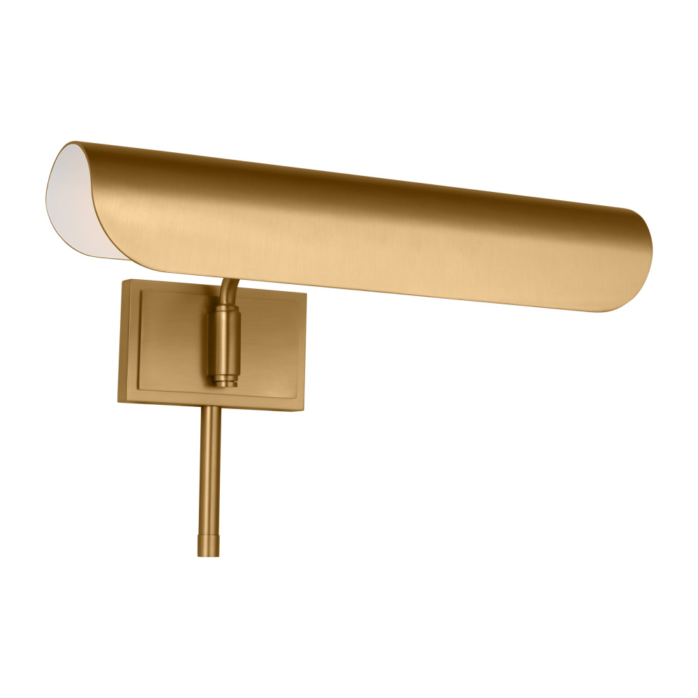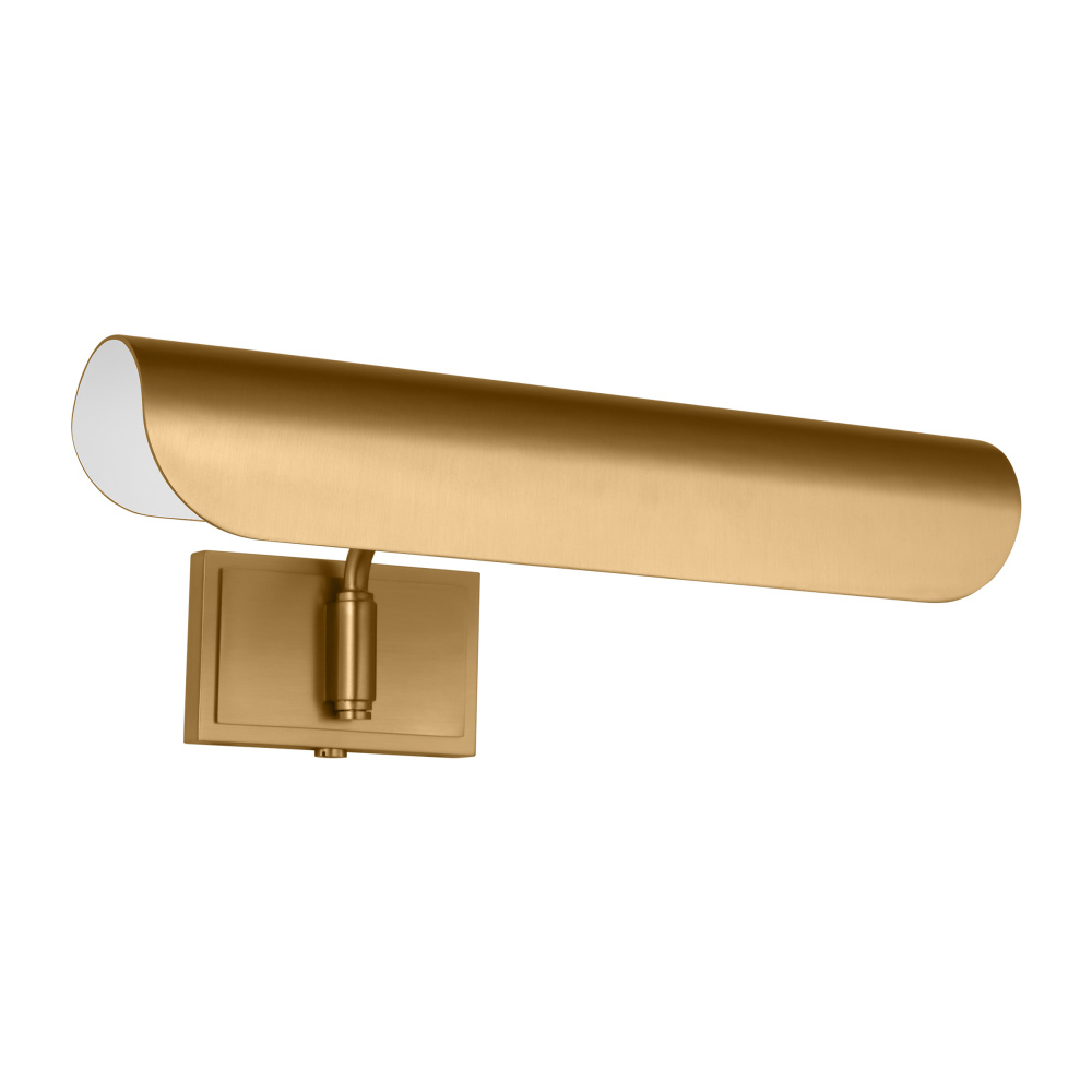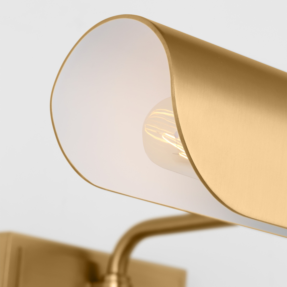 Inspired by a ship's outer hull, the Hull series by Chapman & Myers has a unique shade of these picture lights made from a single piece of metal bent into a cylindrical form. These picture lights have an open-ended design directing light both down and to the sides. A subtle horse saddle design and double barrel back-plate detail that pivots in the direction needed. Available in three sizes and two finish options.