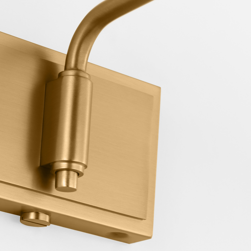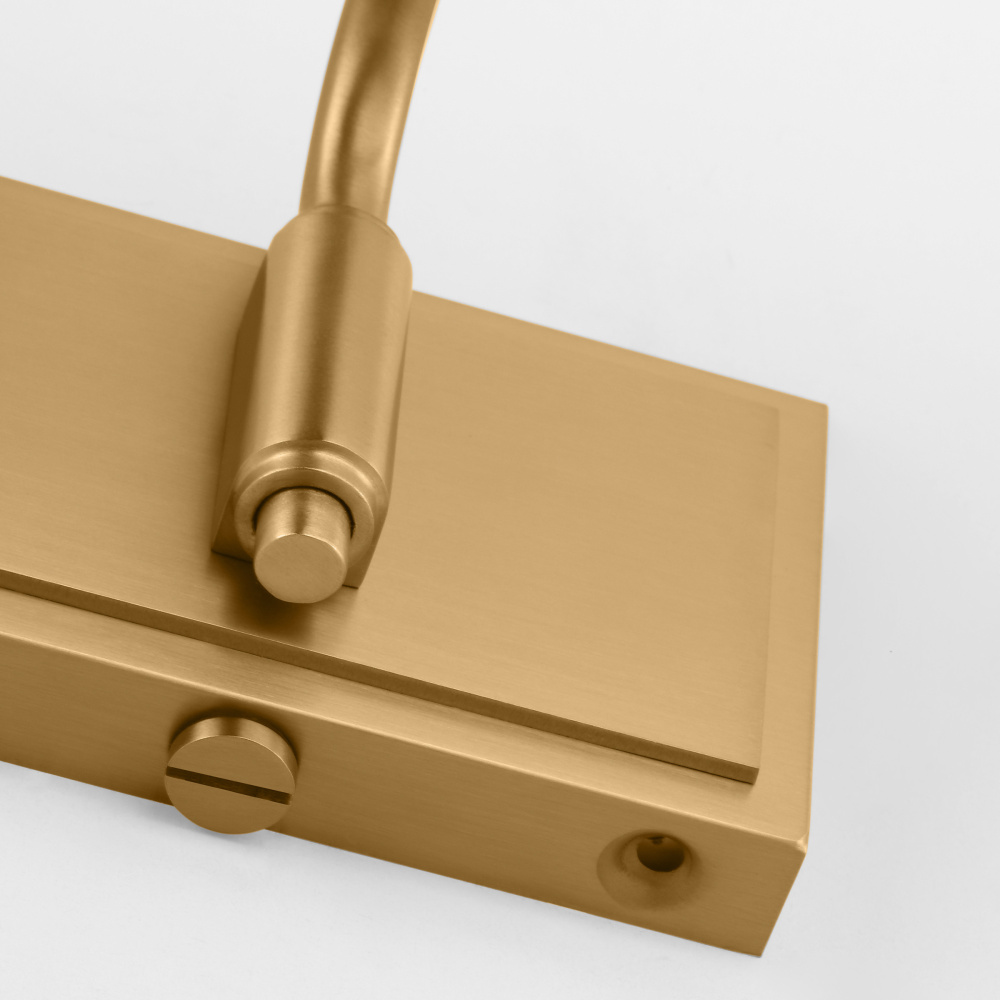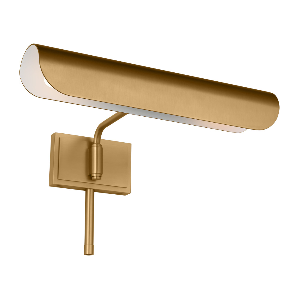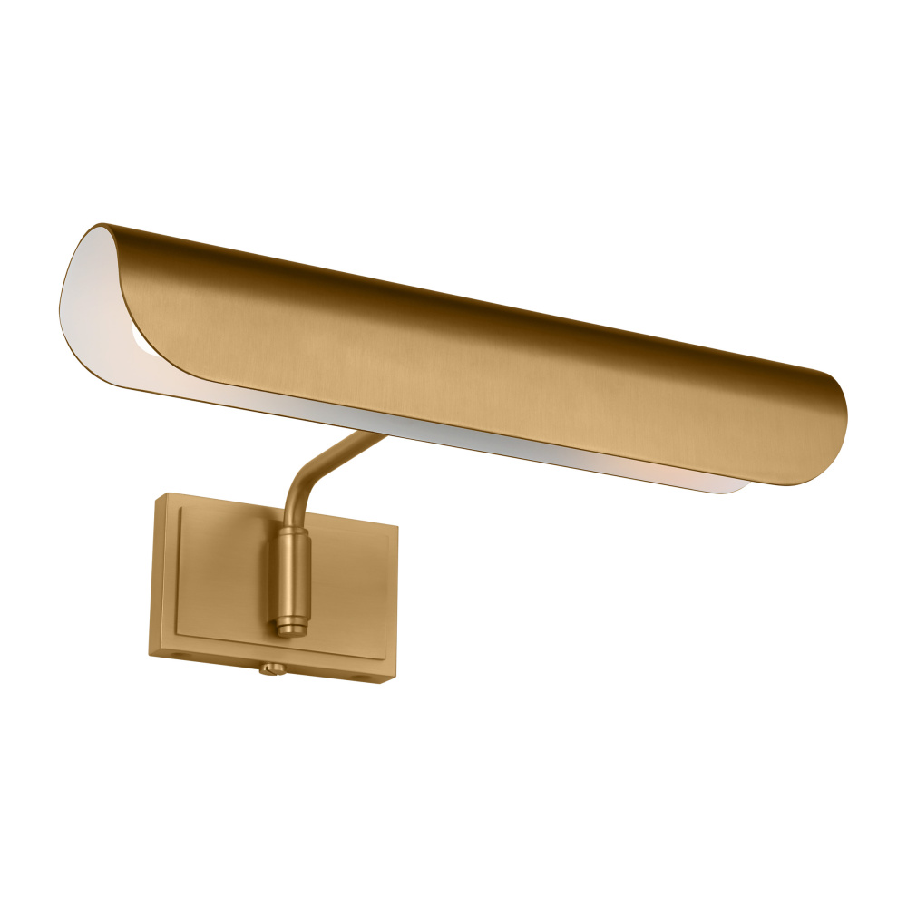 Inspired by a ship's outer hull, the Hull series by Chapman & Myers has a unique shade of these picture lights made from a single piece of metal bent into a cylindrical form. These picture lights have an open-ended design directing light both down and to the sides. A subtle horse saddle design and double barrel back-plate detail that pivots in the direction needed. Available in three sizes and two finish options.