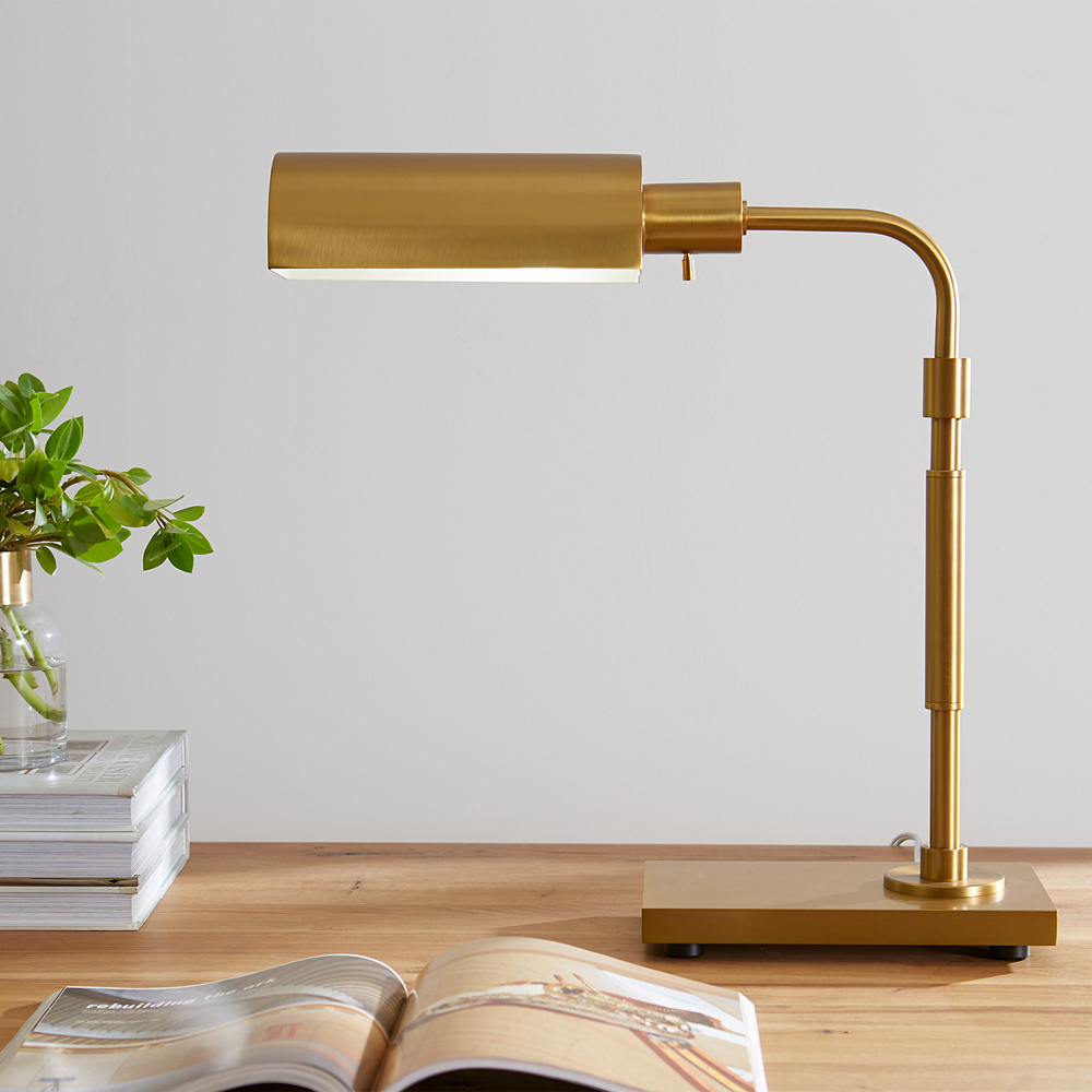 The Kenyon one light floor lamp in burnished brass by Chapman & Myers were designed to be highly versatile in their application, at home in any interior. They have classic half round pharmacy shades which are mounted to a cylindrical metal stem with a differentiated stepped detailing. The Picture lights have an architecturally inspired medallions where the arms mount to the rectangular backplate.