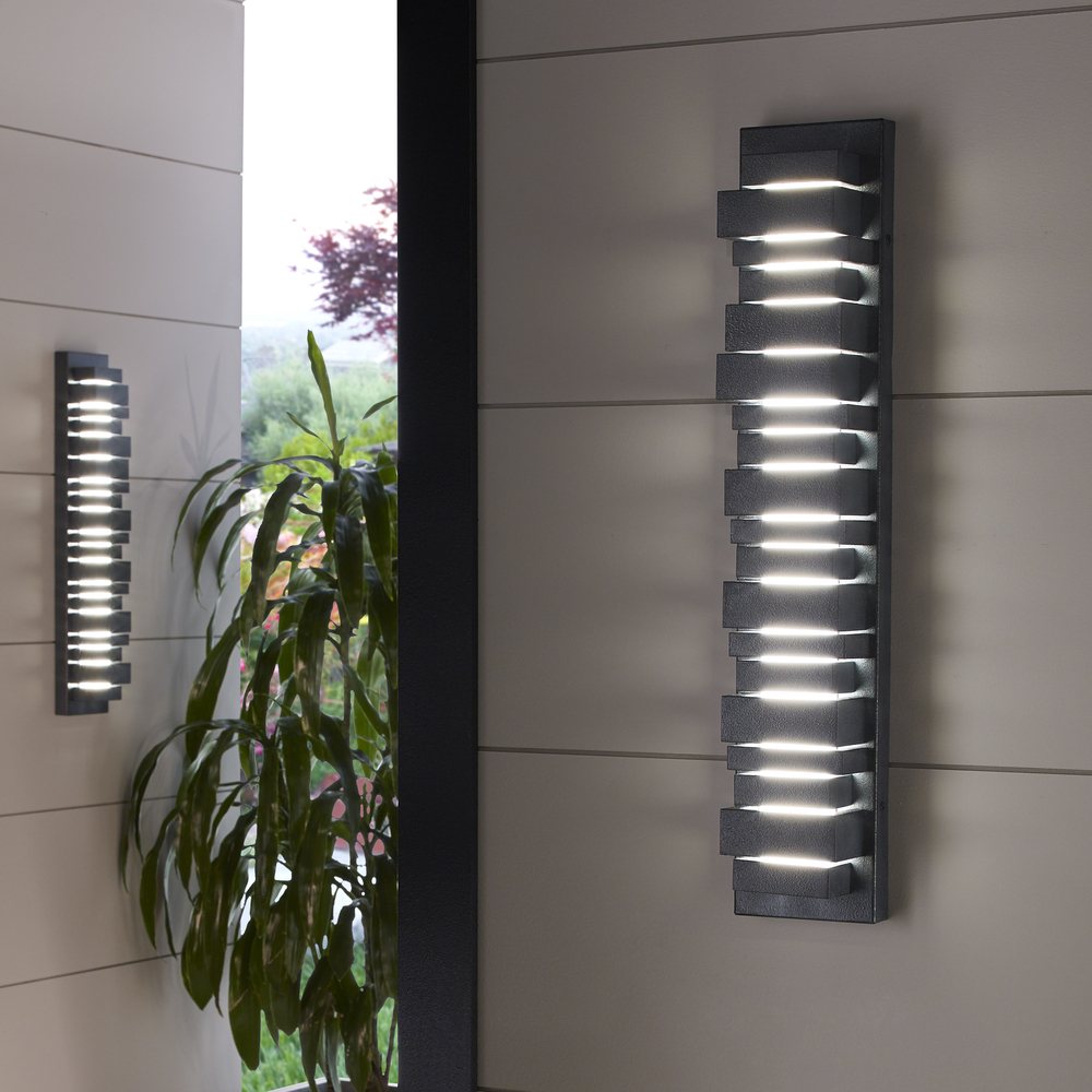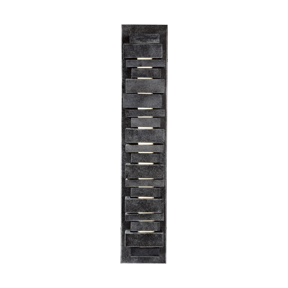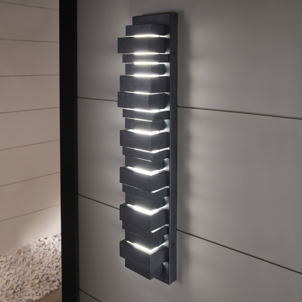 The Ledgend one light outdoor wall fixture in dark weathered zinc enhances the beauty of your property, makes your home safer and more secure, and increases the number of pleasurable hours you spend outdoors. The Ledgend outdoor light wall sconces by are modern and dramatic, making a significant design statement as visitors reach the front door. Energy efficient and long-lasting LEDs direct light forward through off-set openings inspired by stacked flagstone, as well as shining up and down. Made of Cast Aluminum, the fixture has exceptional durability to withstand the harshest elements. With a Dark Weathered Zinc finish, the assortment includes 5", 18" 26and 34" LED outdoor wall sconces.