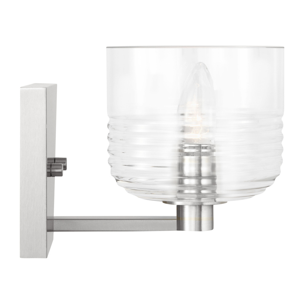 Crafted with Steel in a Brushed Nickel finish with clear ribbed glass shade