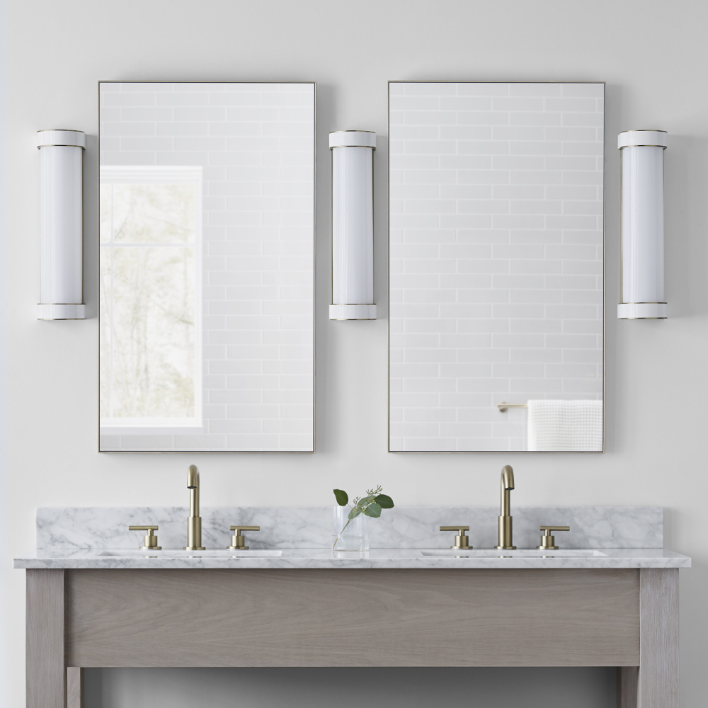 The Monroe vanity is inspired by graphic enameled metal jewelry and decorative accessories from kate spade with a nod to late 50s atomic era colorful designs. Monroe exhibits clean lighting profiles and dressed them up with painted sections and metal accents. Available in a Burnished Brass and Polished Nickel finish.