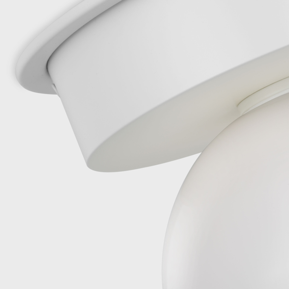 Nodes task, ceiling and wall lighting is minimal yet bold, highlighting Kelly's distinctive juxtaposition of mixed-materiality and curvilinear form. Light radiates from milk glass globes set against metal discs. All fixtures can be used or without the discs. The cast canopy is available in modern finishes. Hanging fixtures within this family feature black fabric cords, while pivot sconces can be cord and plug or hard wire.