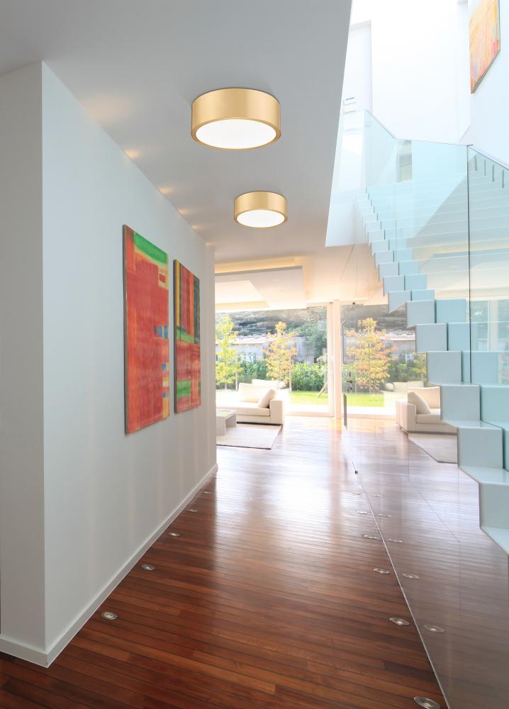 The sophistication of a modern gold finish instantly elevates this modern flush mount LED ceiling light. It features a smooth steel frame, creating a sense of soothing elegance. It includes a dimmable, integrated LED with a frosted diffuser, creating inviting illumination perfect for everything from halls to bedrooms to entryways.
