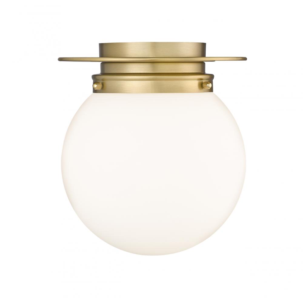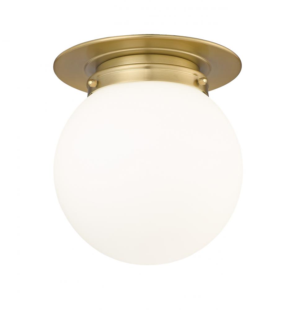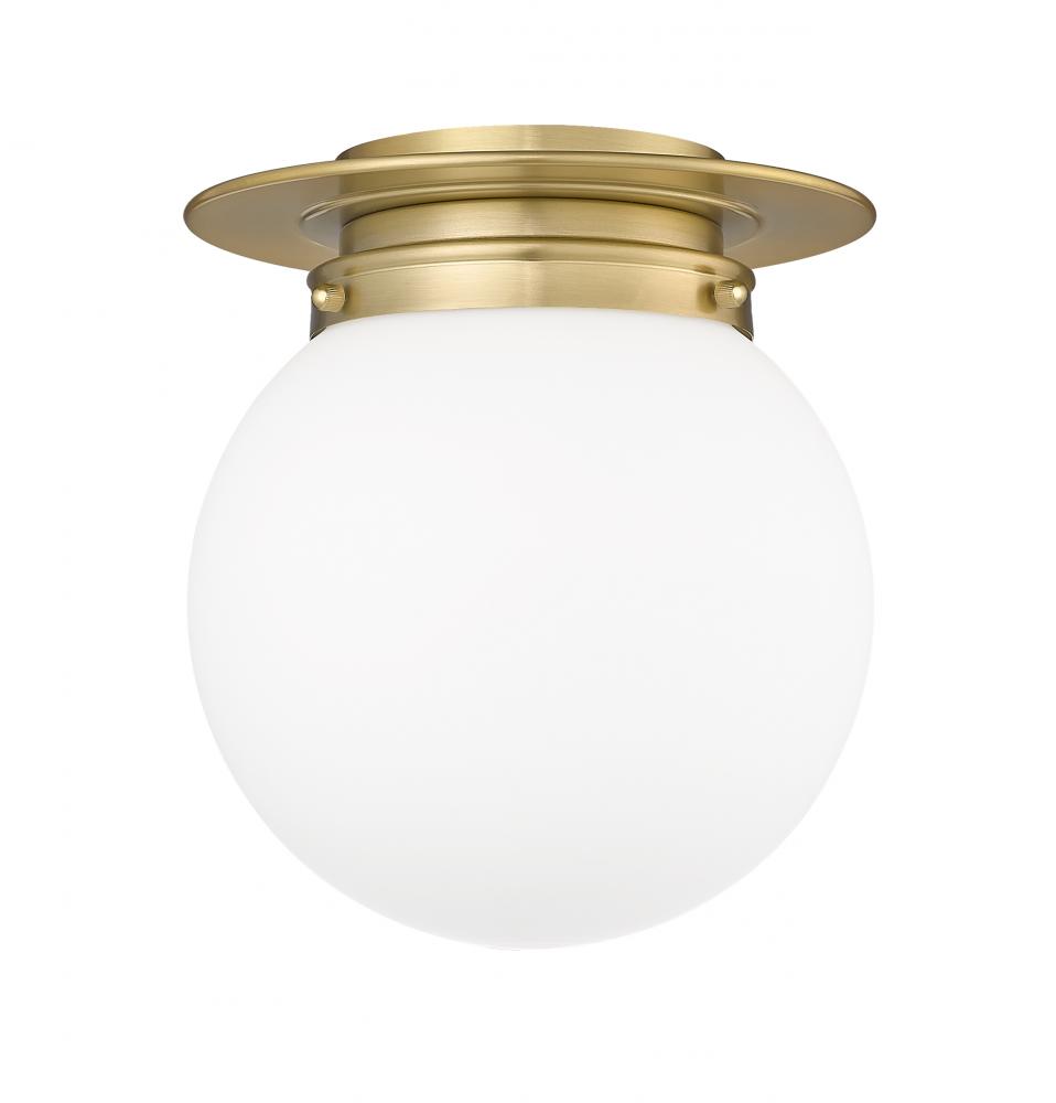 From the Calhoun collection comes a chic one-light flush mount mixing Mid-Century Modern and Schoolhouse motifs, delivering a clean artistic look in any application. This chic fixture stands out with a white glass globe attached to heritage brass steel framing and metal accents, creating a warming impact and a signature statement.