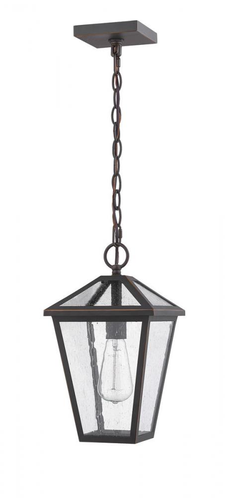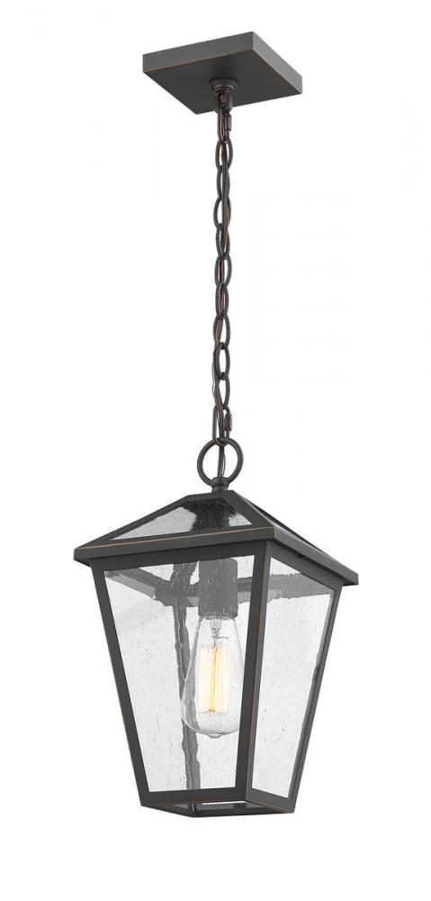 Illuminate an exterior front or back yard space with a classic fixture reflecting a charming village theme. Made from Rubbed Bronze metal and seeded glass panels, this one-light outdoor chain mount ceiling light brings a design-forward look to wrap up a tasteful and functional patio or porch space with soft lighting.