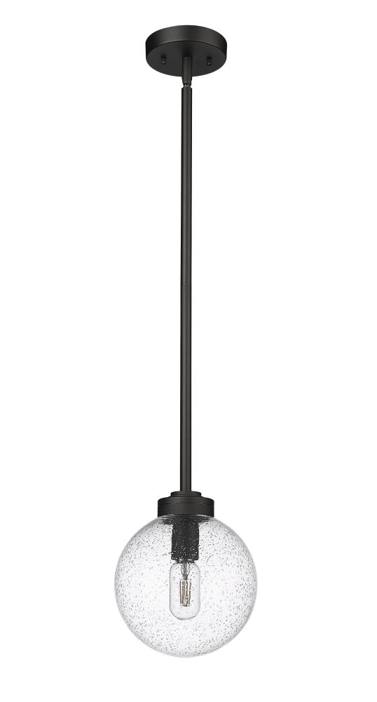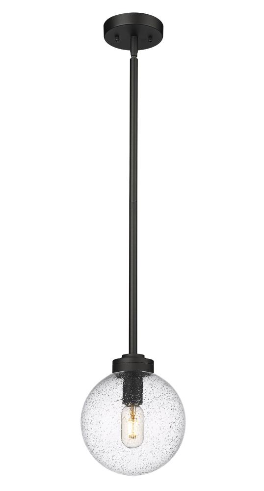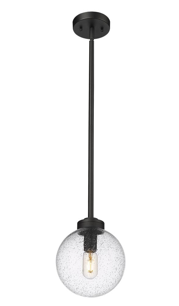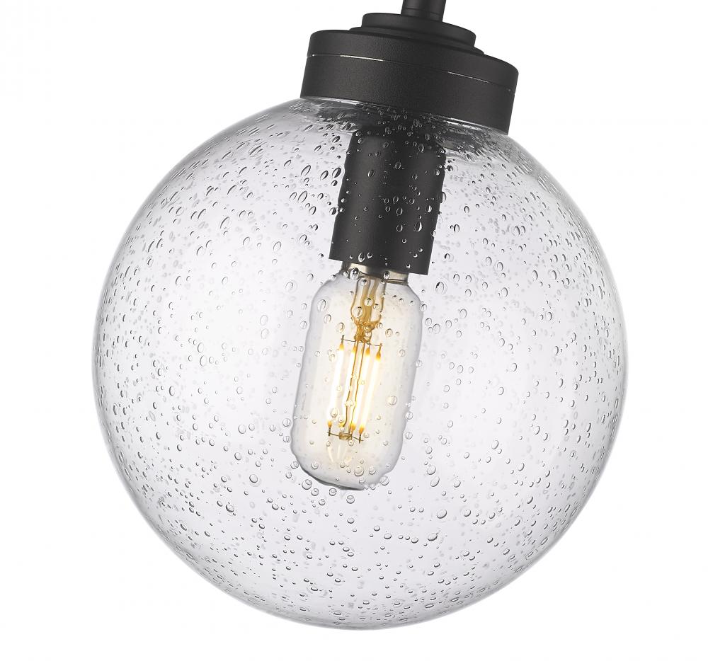 Mid-Century Modern attitude creates retro inspiration in a fixture that dazzles in an outdoor space. Light up a deck or patio with this cheery one-light outdoor pendant reflecting a hint of storied village nautical attitude. Suspending from a black finish aluminum canopy and down rod, its chic, delicate clear seedy glass globe delivers the ultimate in sophistication.