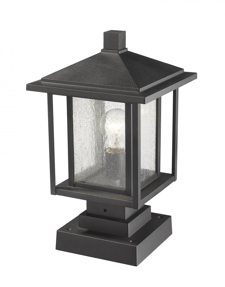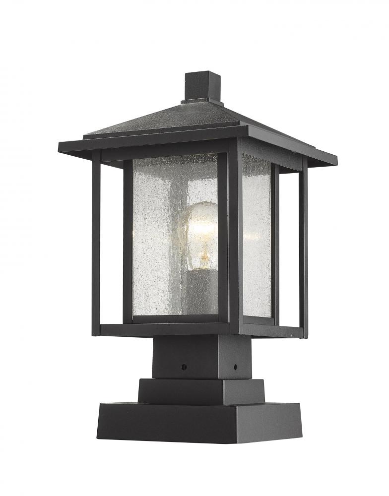 This handsome outdoor pier mounted fixture lends a modern twist to a classic form. Seedy glass creates a heady look in a shade nestled within a dual frame made from durable black aluminium.