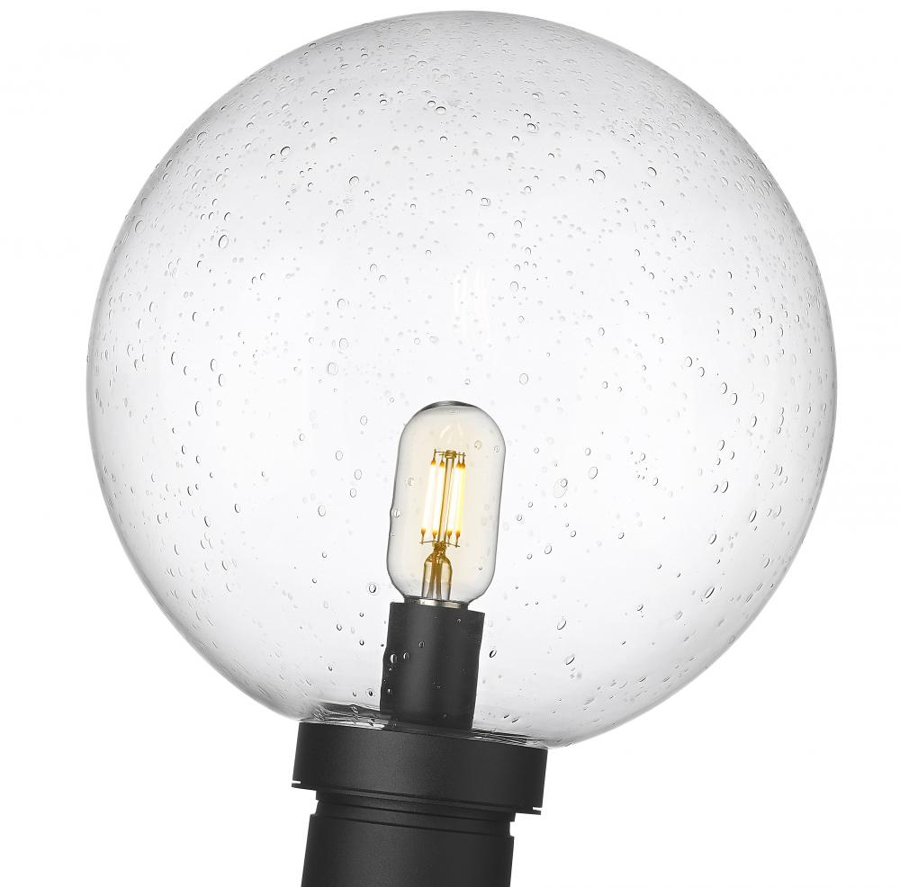 Preserve a simple and sophisticated motif in a quest to supply exterior lighting. This one-light outdoor post mount fixture from the Laurent collection maintains a straightforward design with an aesthetic reminiscent of retro industrial charm. Crafted of black finish aluminum, its simple base is made more festive when topped with a delicate clear seedy glass globe, creating artistry in lighting.