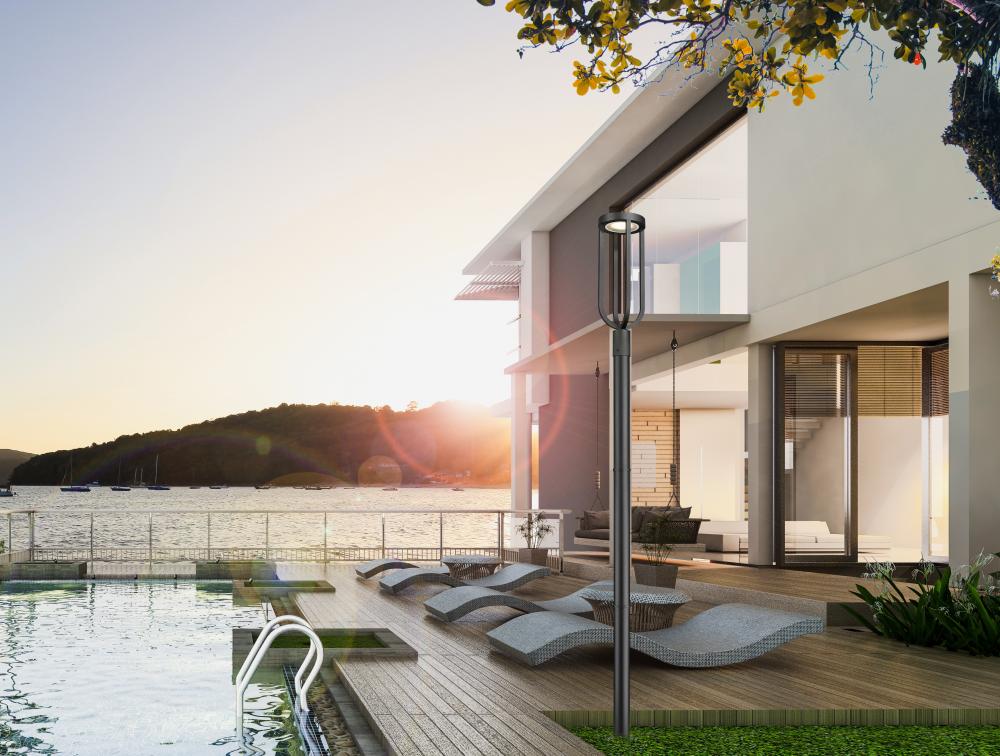 Marrying streamlined design and versatility, a modern one-light outdoor post mount fixture is designed with both a streamlined profile and selectable color temperature. Perfect for your deck, patio, or walkway, the light features an energy efficient LED and a sand black finish for marine-grade durability, all complementing a sleek silhouette that includes an open cage lantern with a teardrop shape that adds graceful elegance.