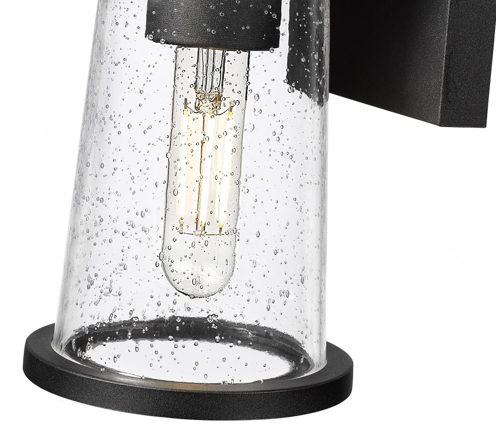 A modern outdoor wall light from the Bar Harbor collection is a striking addition, offering a cone of seedy clear glass thats bold but timeless. Simply charming flanking a garage or front entryway, the light boasts a lantern-inspired silhouette streamlined for a contemporary ambiance that overflows with character. A marine-grade sand black finish is lasting and built for durability in outdoor environments, perfect for virtually any space.