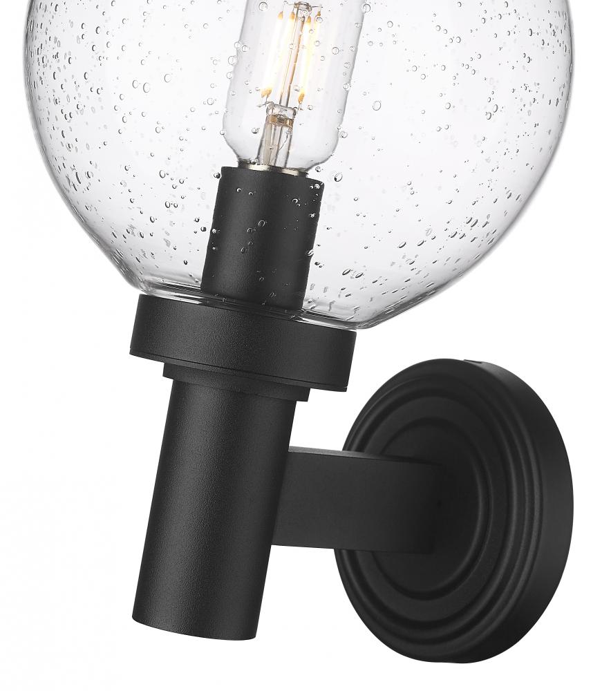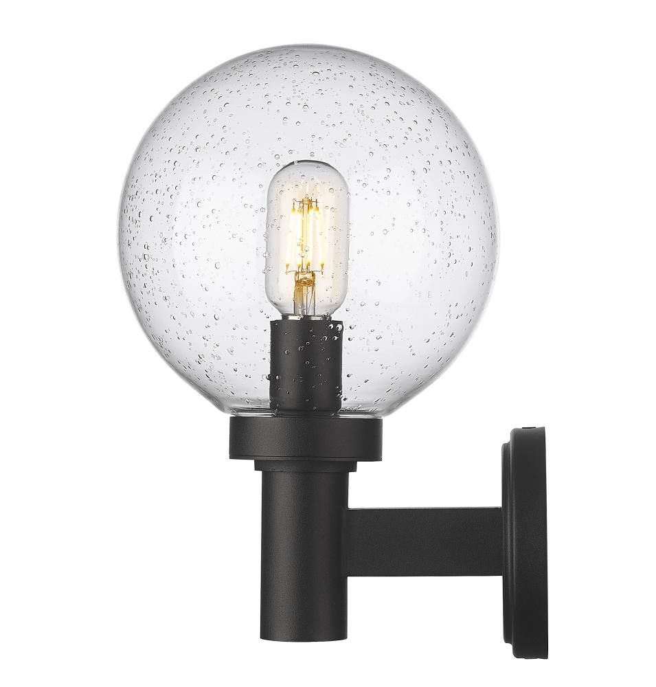 A blend of Mid-Century Modern personality and updated linear silhouetting plays into the tasteful look of a classic exterior light fixture. From the Laurent collection comes a one-light outdoor wall sconce with an updated nautical village feel. A simple yet tasteful black finish aluminum frame and wall plate hosts a chic globe shade fashioned of delicate clear seedy glass.