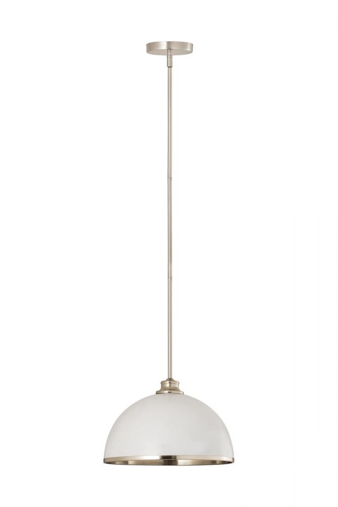 Chic, modern vibes add a stunning look to a custom kitchen, living space, or bedroom with this domed metal one-light pendant. A domed shade crafted of matte white finish stainless steel is trimmed in brushed nickel finish metal with a brushed nickel finish down rod and canopy. This updated pendant is suitable for a variety of d?cor schemes including farmhouse, modern industrial, and urban modern.