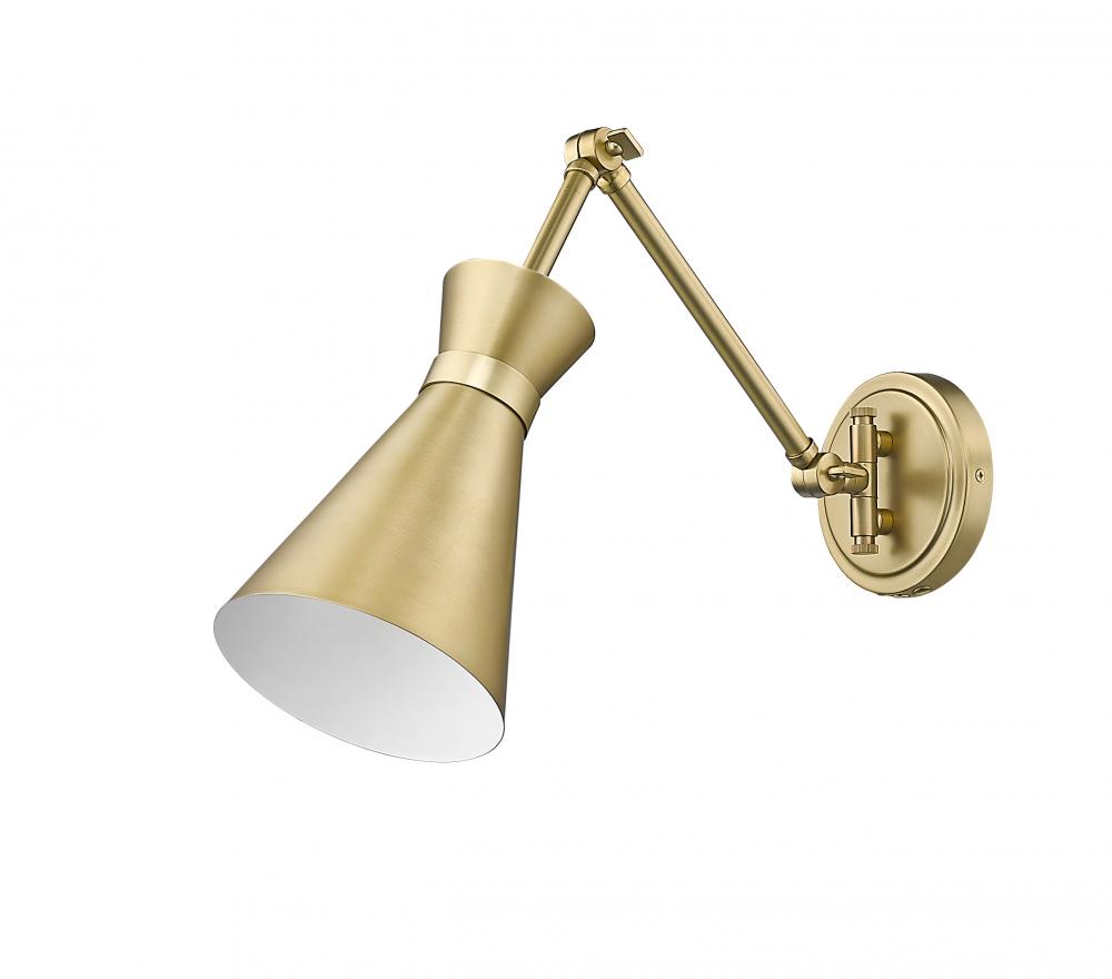 Mid-Century inspired tuxedo style highlights a charming wall sconce. Its metal shade showcases an hourglass profile, complete with an articulating arm for easy adjustment and precise lighting. Modern gold is the perfect finish accent, offering a rich, refined look and feel that complements in any setting. Install through hard-wiring or install cord-and-plug mounting to allow movement from space to space.