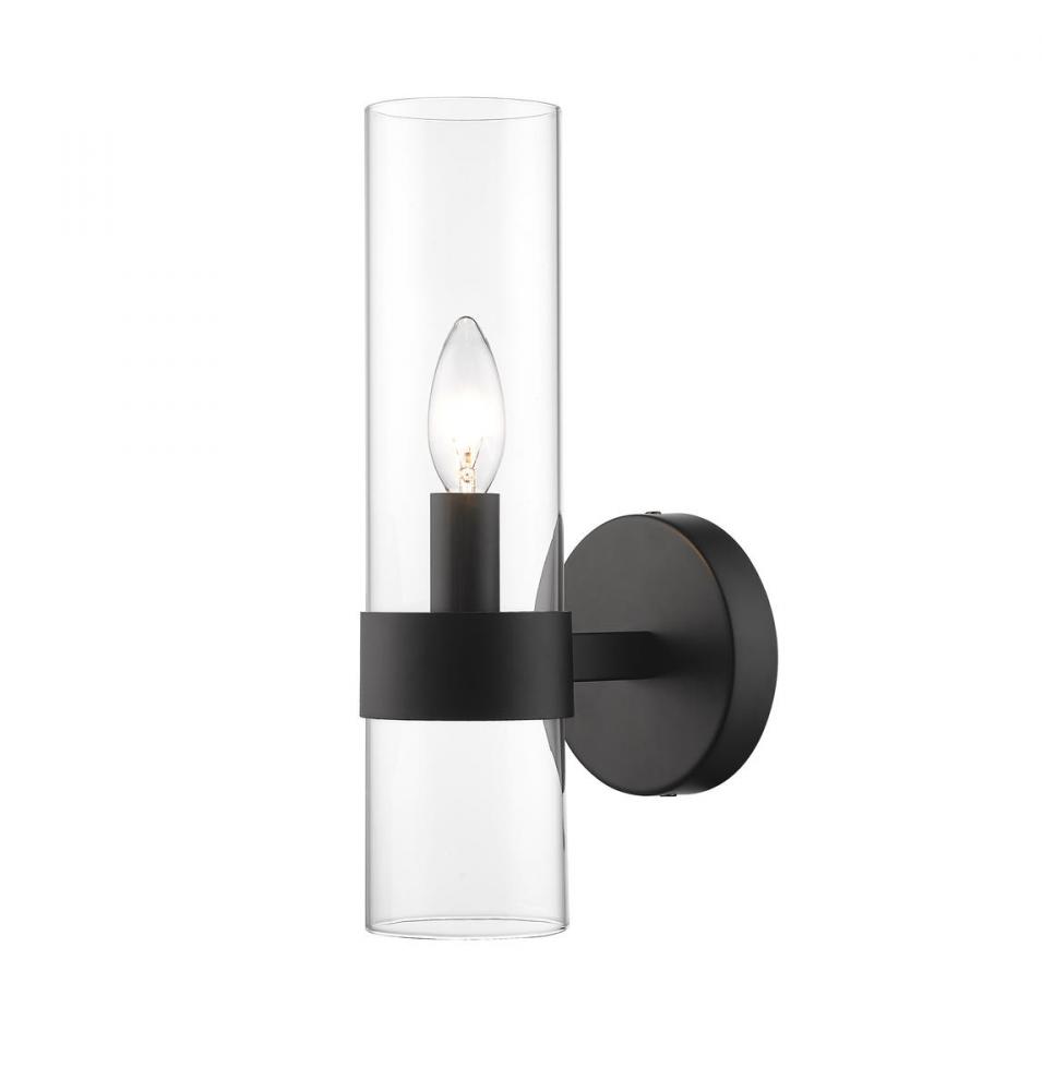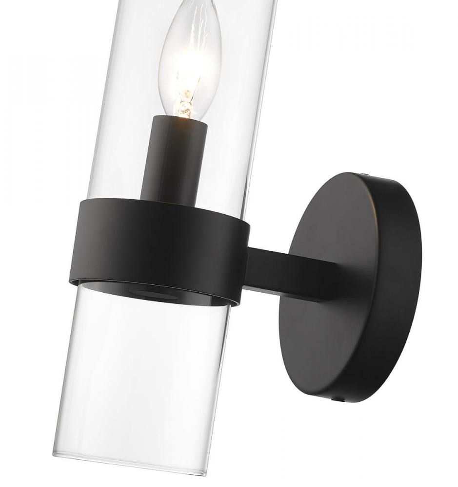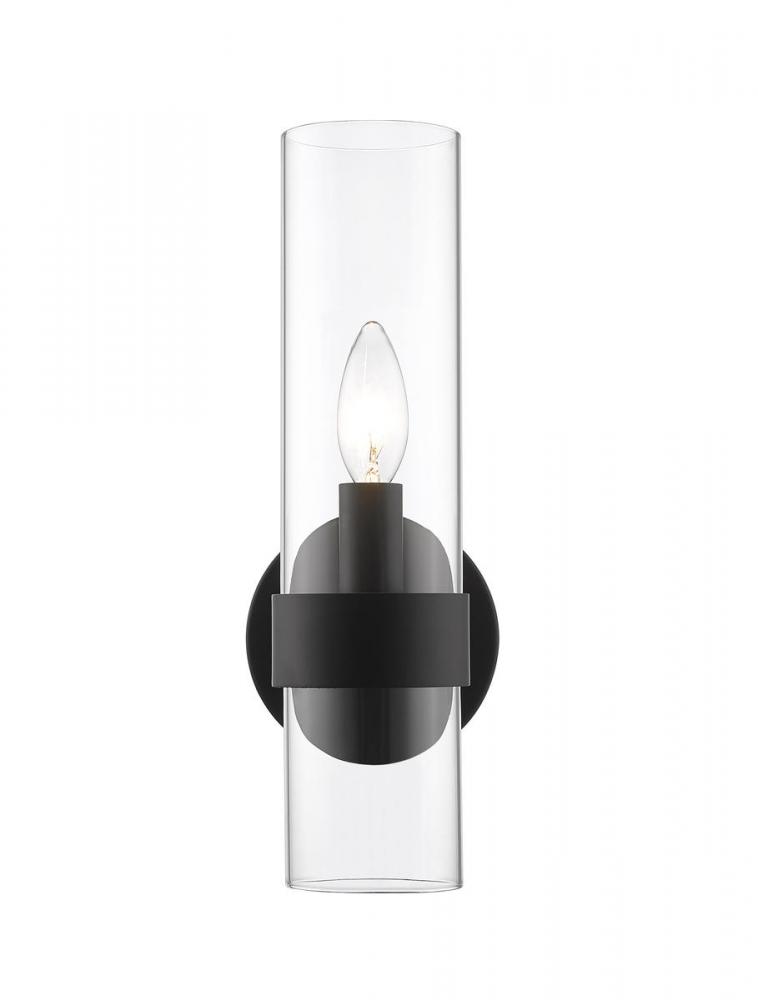 A bold matte black metal frame offers a hint of drama to this distinctive Datus one-light wall sconce. Contemporary vibes infuse an easy-living attitude with prominence in a sleek design featuring a slender clear glass cylinder shade mounted to a matte black finish solid steel frame and mount. Bring ambient lighting to a hallway, bath space, or main living area with this sconce with a minimalist yet impressionable flavor.