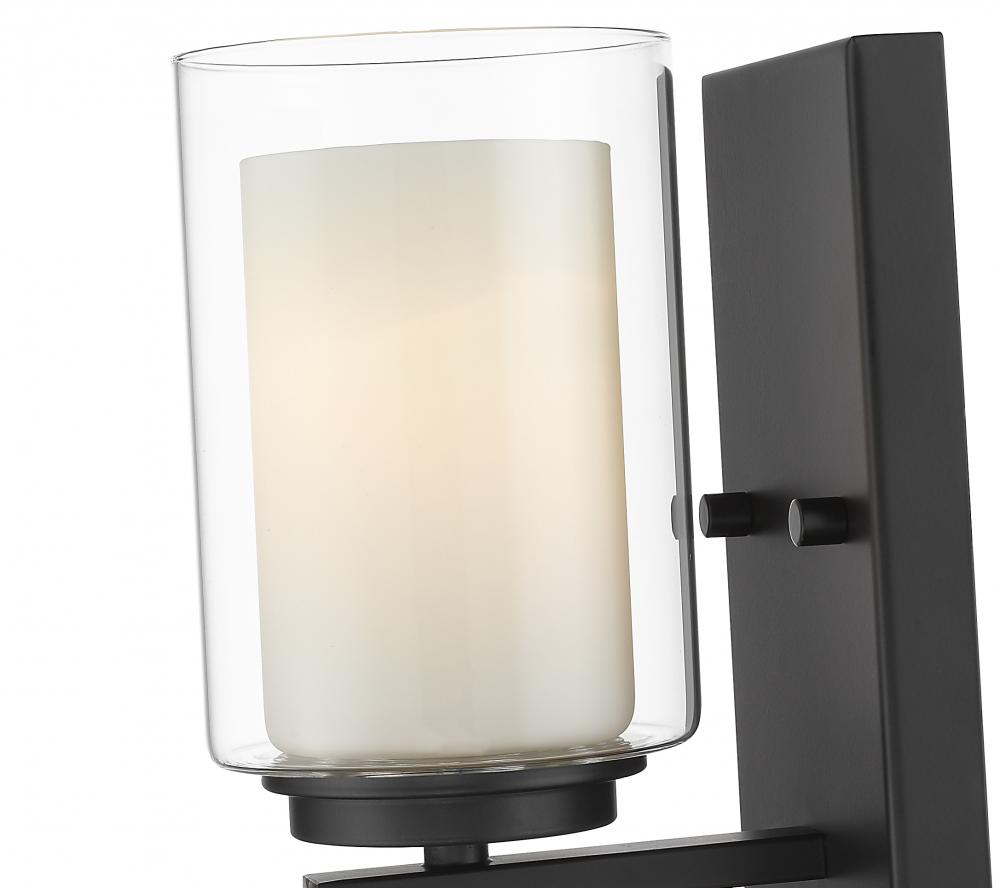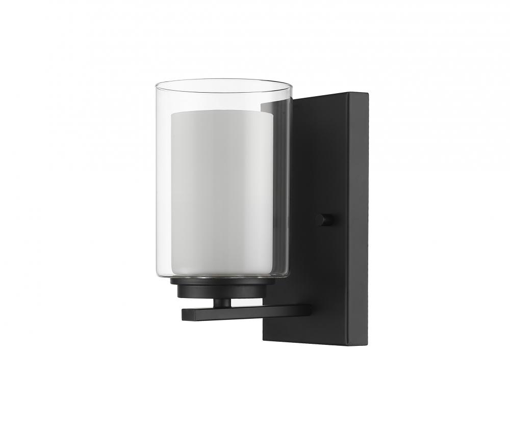 Give your bedroom or powder room a chic, sophisticated update. This beautiful, matte black wall sconce features a single, glowing bulb beneath a delicate, glass shade thats matte opal on the inside and clear on the outside. An exquisite lighting option to highlight your refined sense of style.