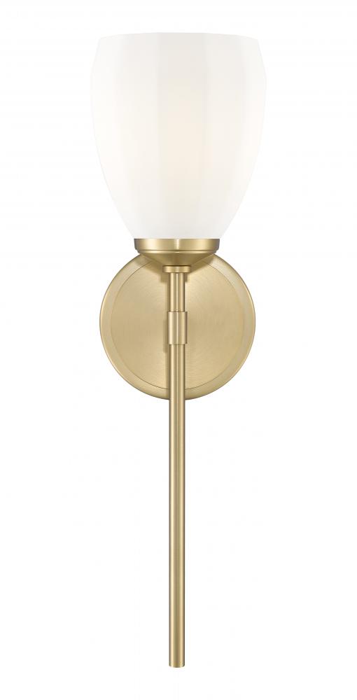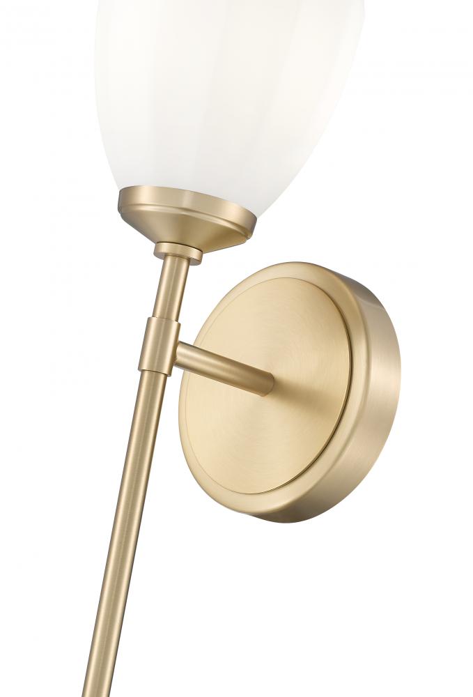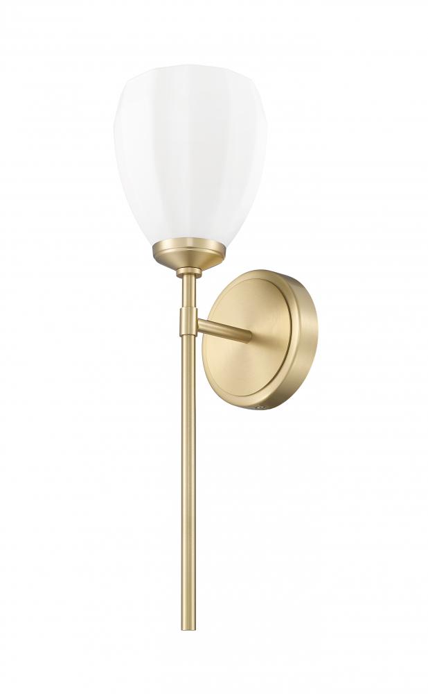 The beautiful warmth of a modern gold finish lends subtle glam sophistication to this contemporary one-light wall sconce for the bath. It botanical silhouette is enhanced with a slim stem and defined with its delicately faceted opal glass shade. Casting bright ambiance and upward illumination, this fixture is perfect flanking a vanity or dressing space.
