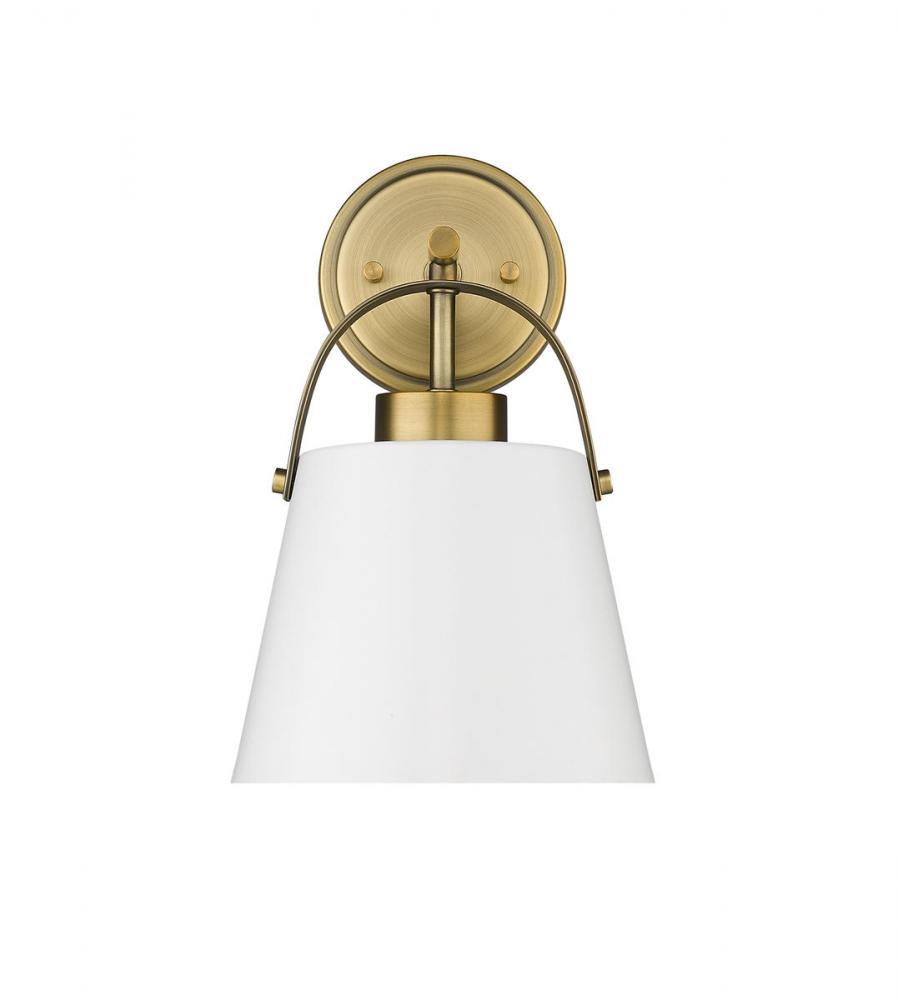 Choose sophistication to bring uplifting elegance in a casual space, adding this single-light wall sconce from the Z-Studio collection. Its tasteful farmhouse industrial design features a conical matte white finish steel shade with heritage brass finish steel accents. Fresh styling contributes to a striking look as it delivers ambient lighting to hallways, bath spaces, and main living areas.