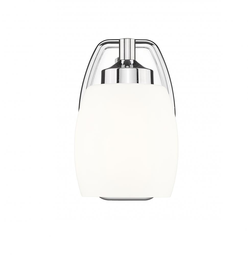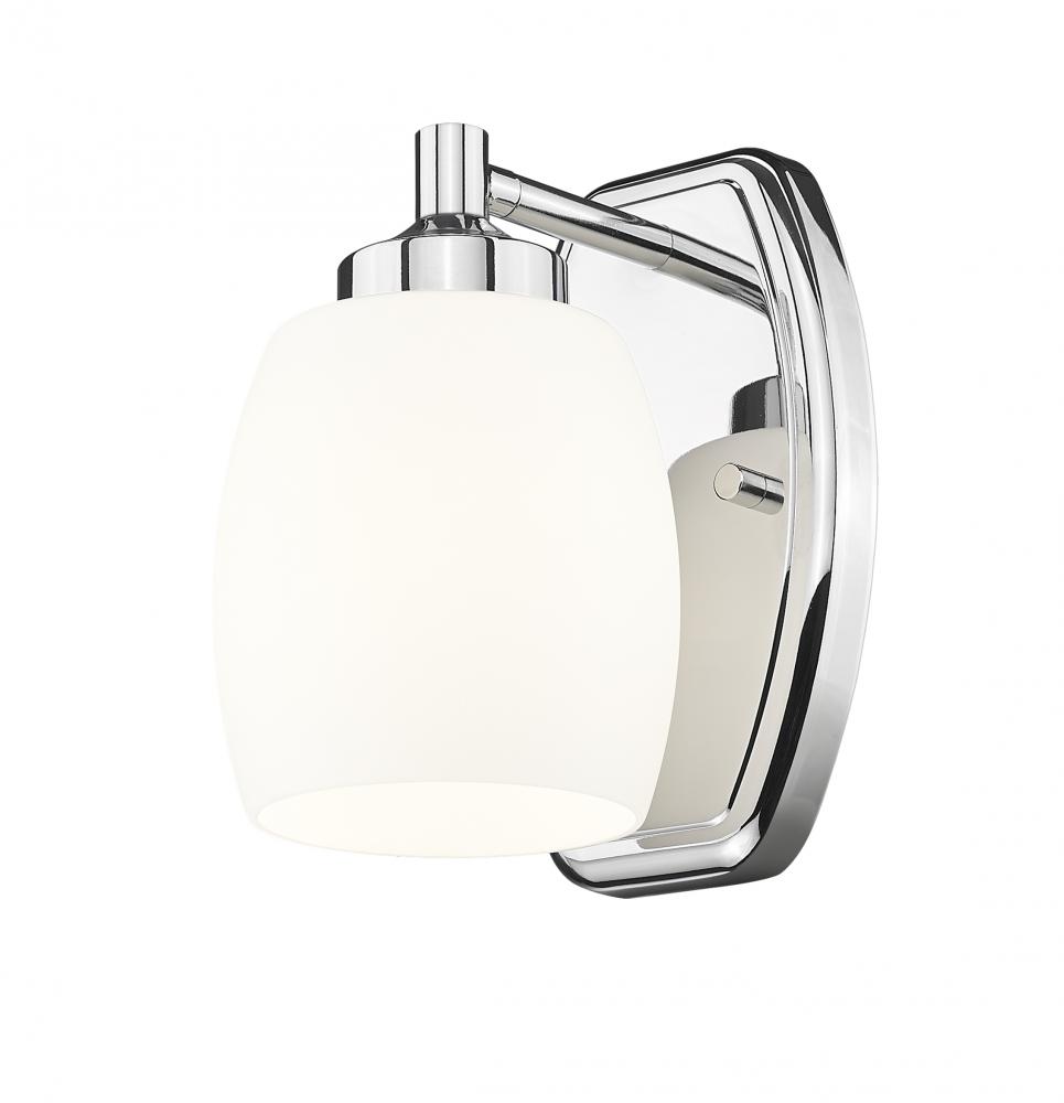 The soothing simplicity of matte opal glass contrasts beautifully with the gleaming chrome finish of a modern one-light wall sconce. Beautiful in a bath or living area, it showcases simple, smooth curves in both its wall plate and shade.