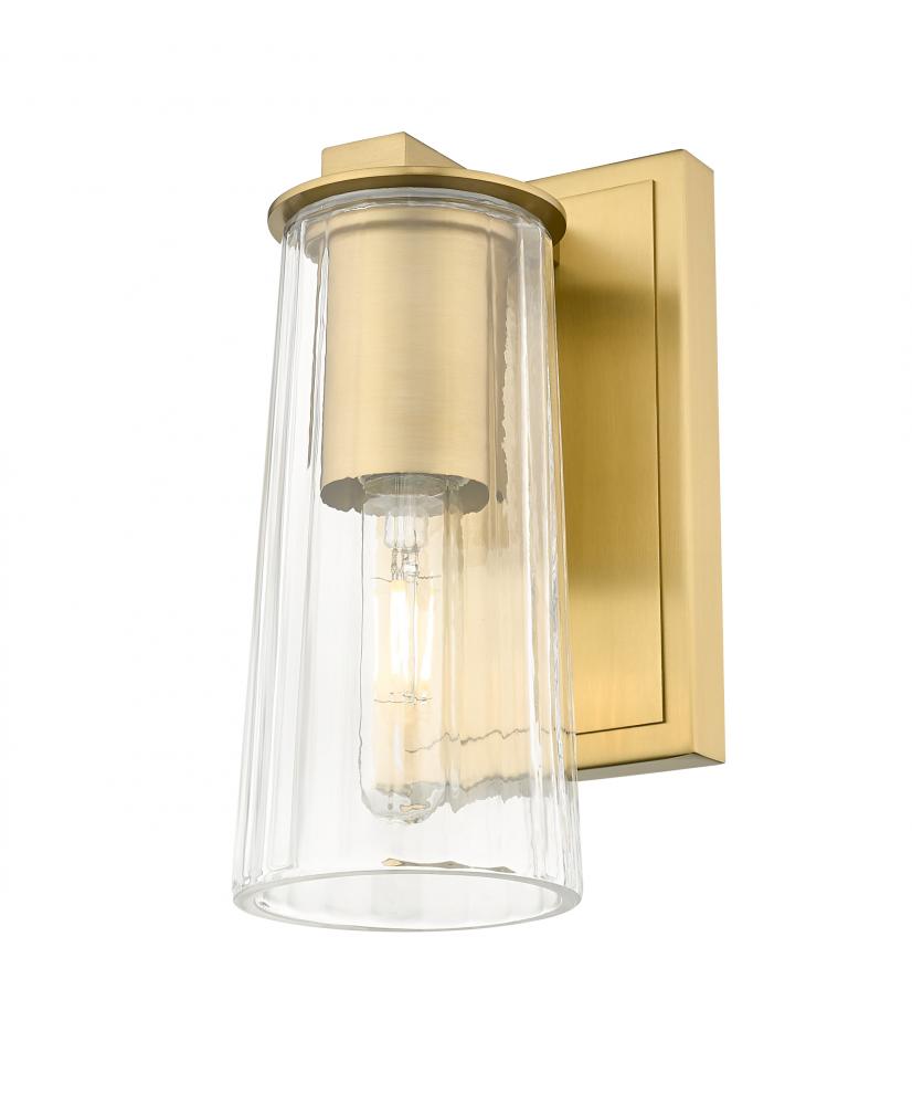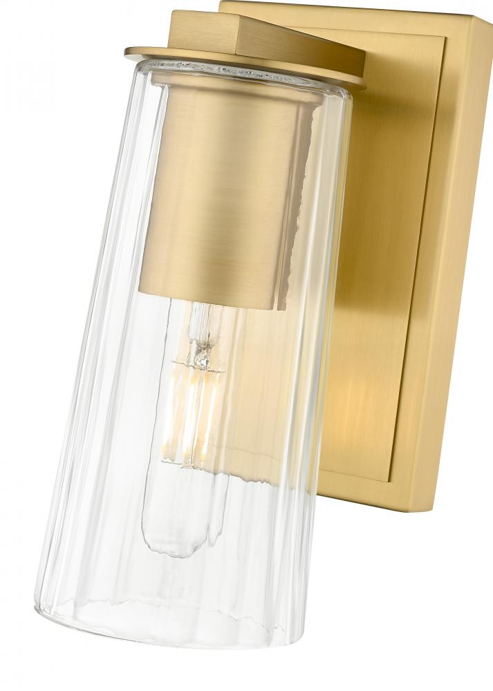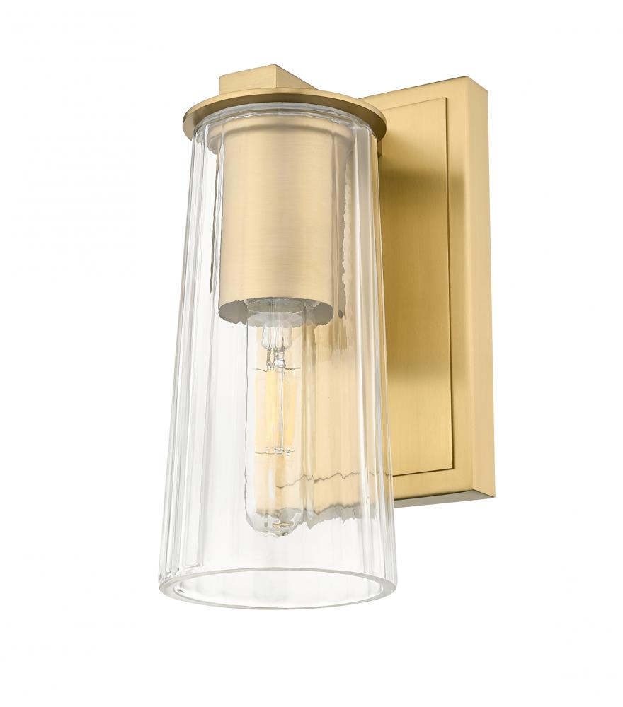 A finish of sophisticated modern gold pairs perfectly with the delicate profile of this modern one-light wall sconce. Charming in a living or dining room, it boasts a rectangular wall plate and tapered glass, with a tubular bulb tucked within to create a hint of vintage character. A perfect complement to elegant but approachable interior design.
