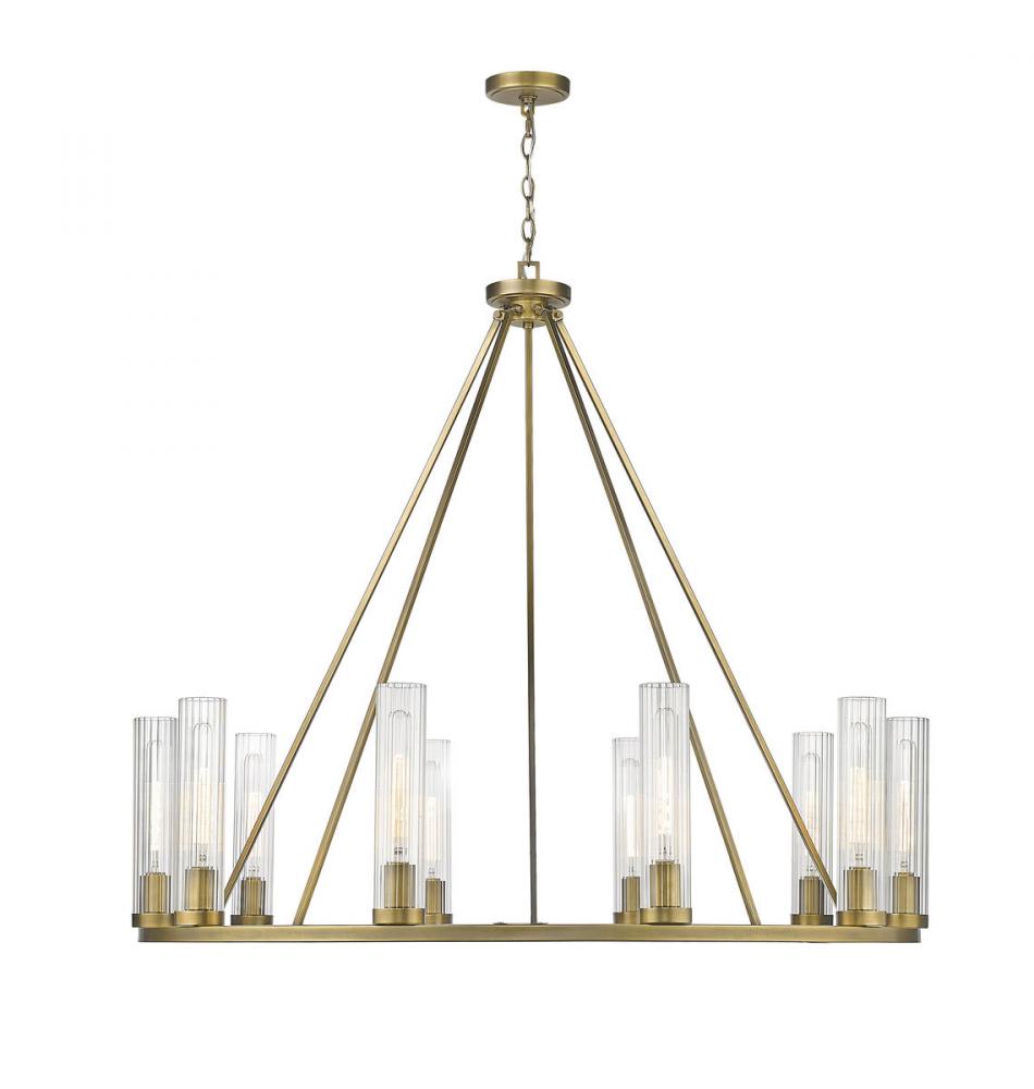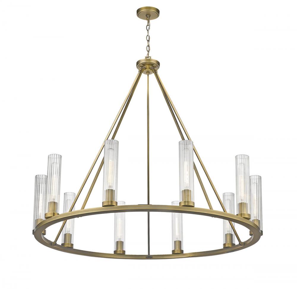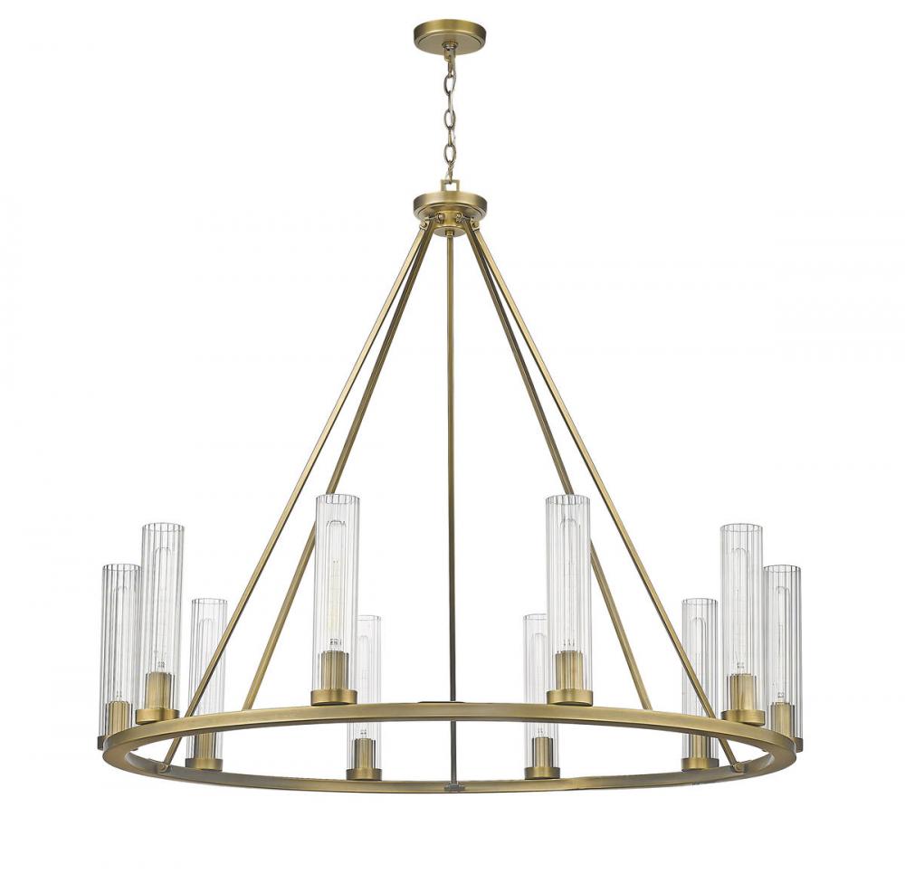 With its textured glass shades and rich rubbed brass finish, this ten-light chandelier adds effortless sophistication to a transitional or modern home. Suspend this stately fixture over a dining table to illuminate your surroundings with warm ambiance.