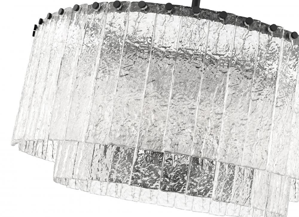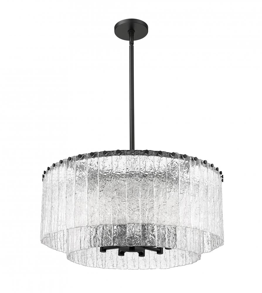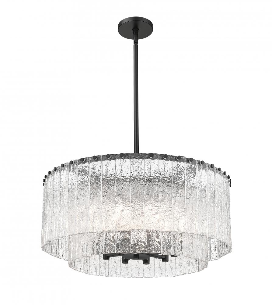Gleaming icy glass panels encircle two tiers to create the refined look and feel of this modern 10-light pendant. A radiant centerpiece, it boasts a matte black finish over its minimalist frame, built from steel for excellent performance and longevity. Its elongated panels of textured clear glass diffuse illumination, beautiful over a dining table, bedroom or foyer.