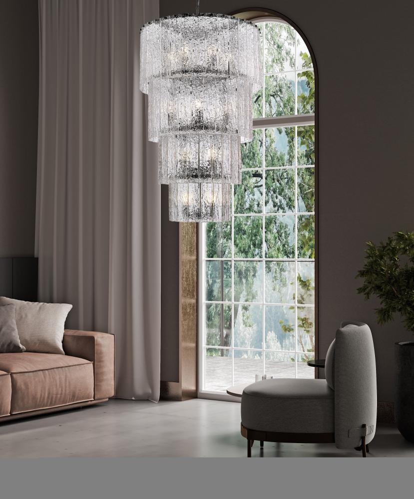 With the delicate beauty of melting ice, Glacier is comprised of individual panels of textured glass that soften the illumination, preventing glare from the light source. Just like real ice, the glass panels, seem to glisten in the light which creates the