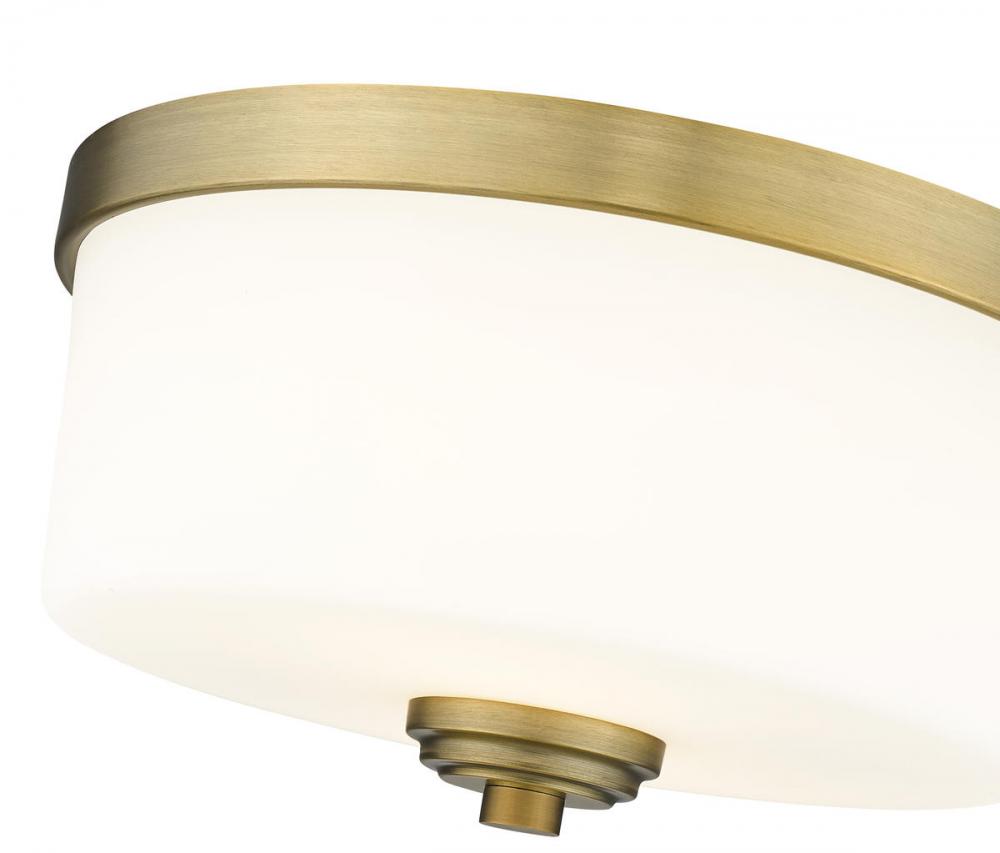 Custom updates energize the personality of this three-bulb flushmount ceiling light, a superbly versatile choice for a kitchen, dining area, or entryway. A deep round shade is fashioned of matte opal glass, pairing beautifully with heritage brass finish metal accenting.