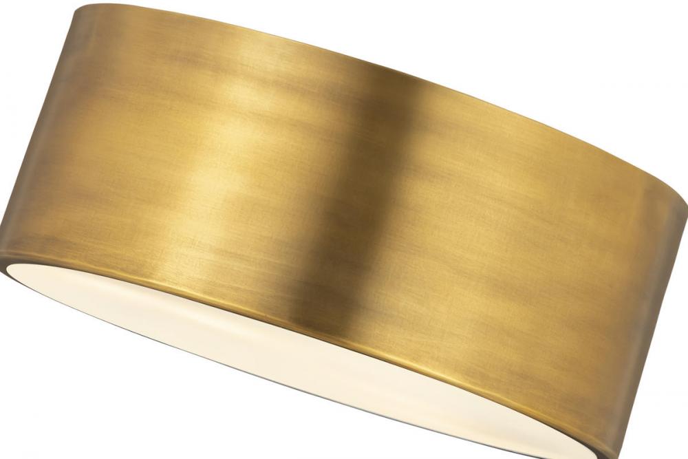 Elegant simplicity offers a minimalist design that captures attention, making this contemporary flushmount metal drum two-light ceiling light a versatile selection. This light from the Harley collection is perfect for casual, easy living spaces, offering a sleek large-form silhouette with a shade made of warm rubbed brass finish steel. Bring industrial-inspired vibes to a kitchen, dining space, or hallway with this tasteful fixture.