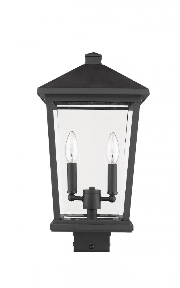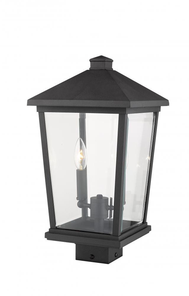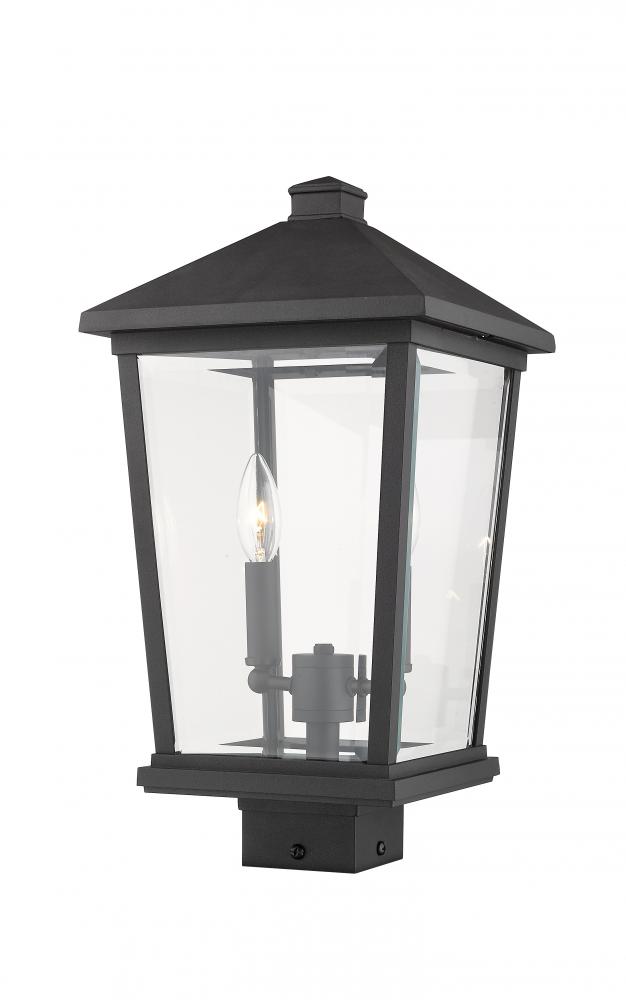 The versatile personality of this black finish outdoor post lantern proves useful in multiple exterior settings. Light up a walkway, front yard, or cultivated garden with a charming light featuring a pair of candelabra-style bulb bases behind sleek clear beveled glass.