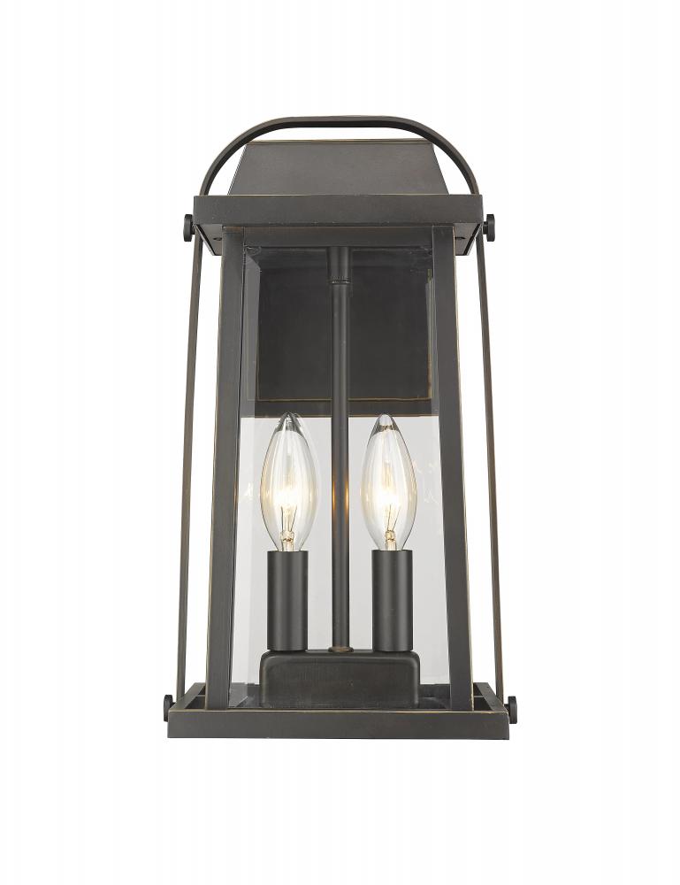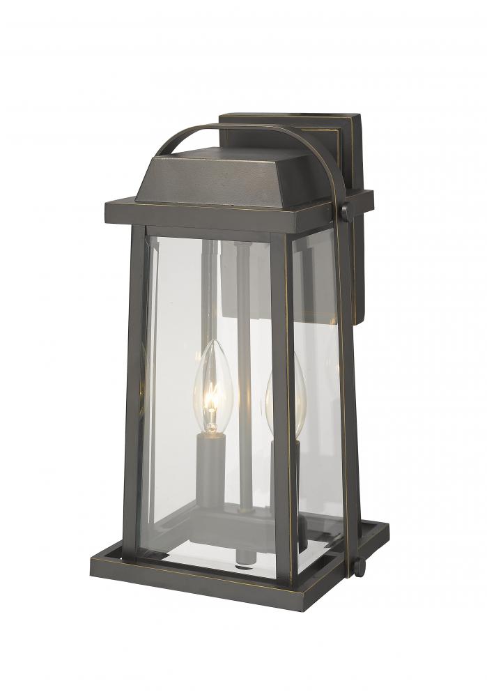 Enhance an inviting, welcoming atmosphere with this charming two-light lantern wall sconce at your front entry. Featuring candelabra lights, the sconce shows off clear beveled glass with an oil rubbed bronze frame finish for a warm final touch.