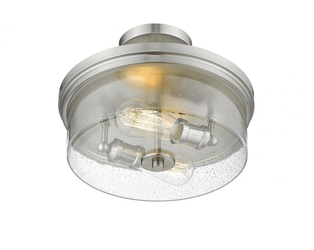 Create an exceptional contemporary or transitional design scheme with the classic styling of this two-light semi-flush mount ceiling light. Enjoy the versatility of elegant brushed nickel in a steel frame, and the romantic clear seedy glass shade that finishes its exquisite composition.