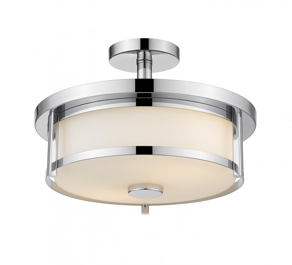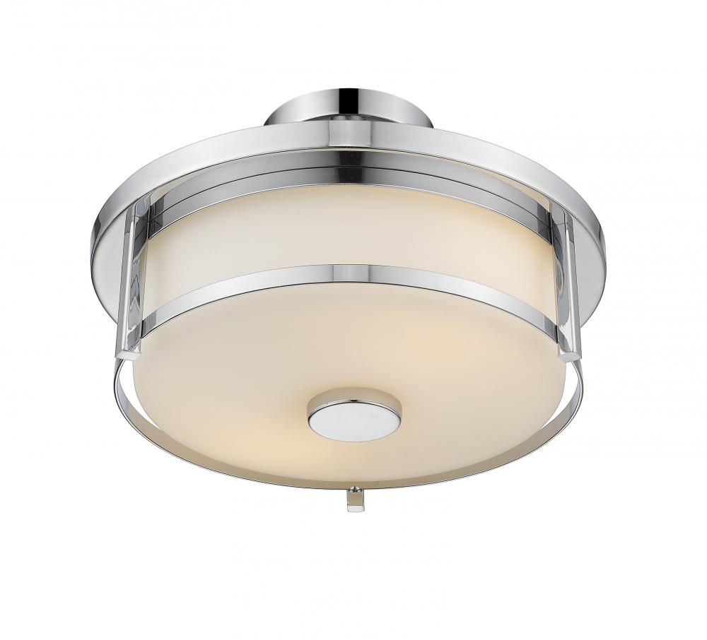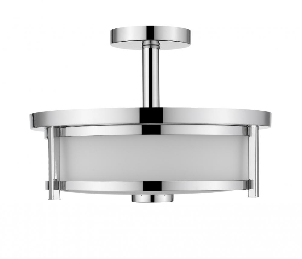 Wrap up the design details of a contemporary space with this exquisite two-light semi-flush mount ceiling light. Offering a hint of sleek mid-century styling, its brilliant chrome finish frame contrasts beautifully with a soft matte opal shade to deliver versatile beauty.