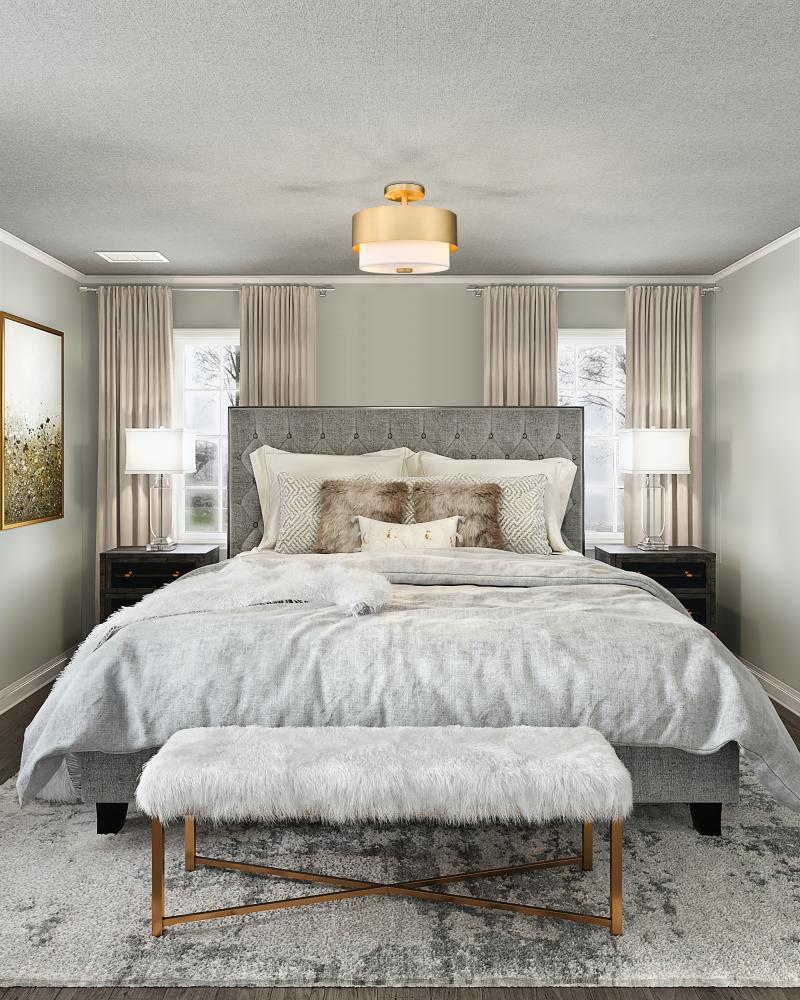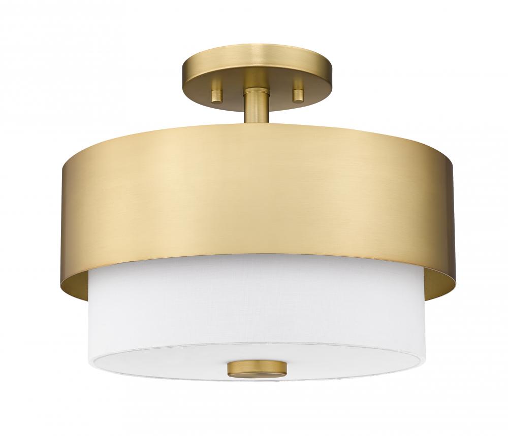 Mid-Century Modern inspired design elements create a semi-flush mount ceiling light draws focus upwards and delivers a sharp, clean look in a contemporary or transitional space. This two-light fixture from the Counterpoint collection reflects a cheerful round silhouette with a cool modern gold metal frame and a soft white fabric shade. Call on a relaxed look to meet trending design aesthetics infusing ambient lighting in a kitchen, living area, or foyer.