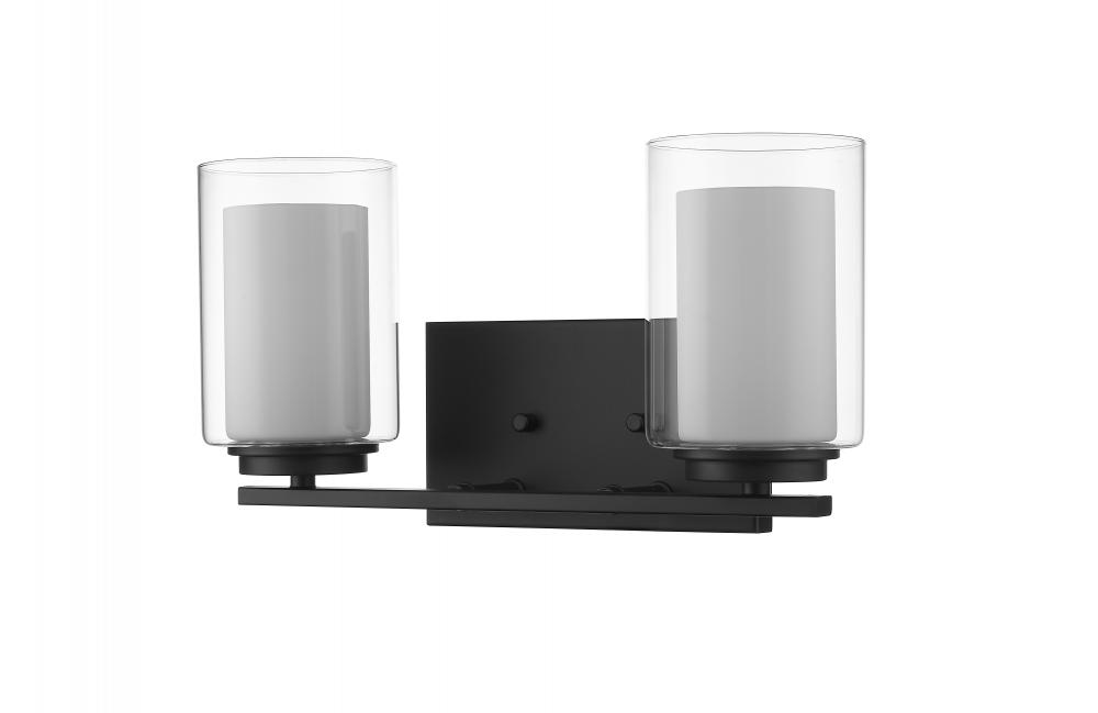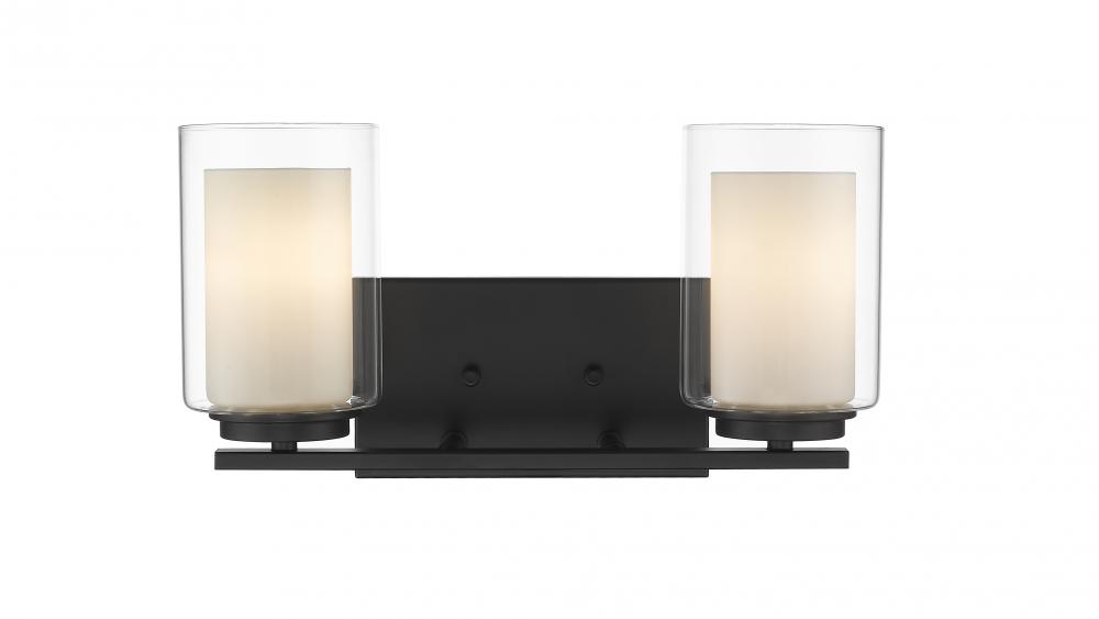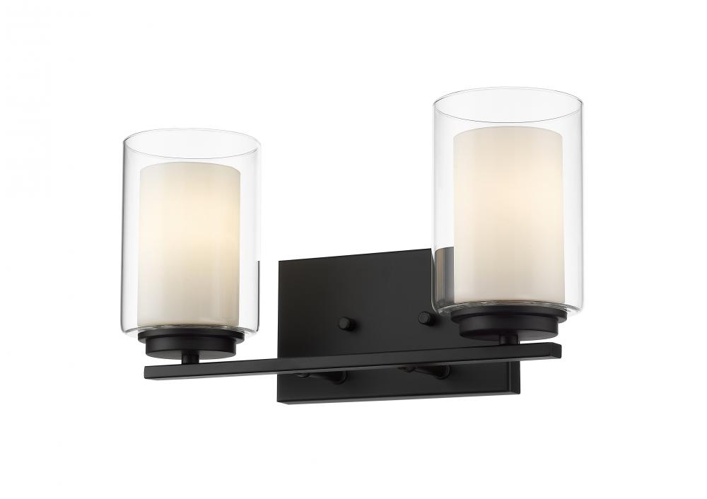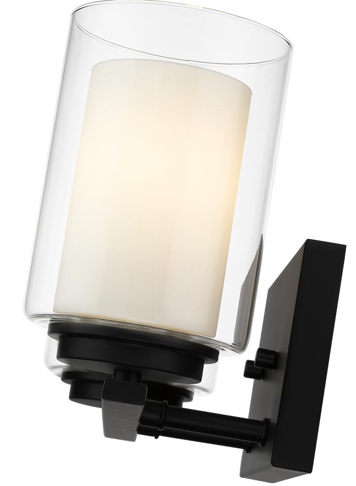 Give your bedroom or powder room a chic, sophisticated update. This beautiful, matte black wall sconce features two glowing bulbs beneath two delicate, glass shades that are matte opal on the inside and clear on the outside. An exquisite lighting option to highlight your refined sense of style.