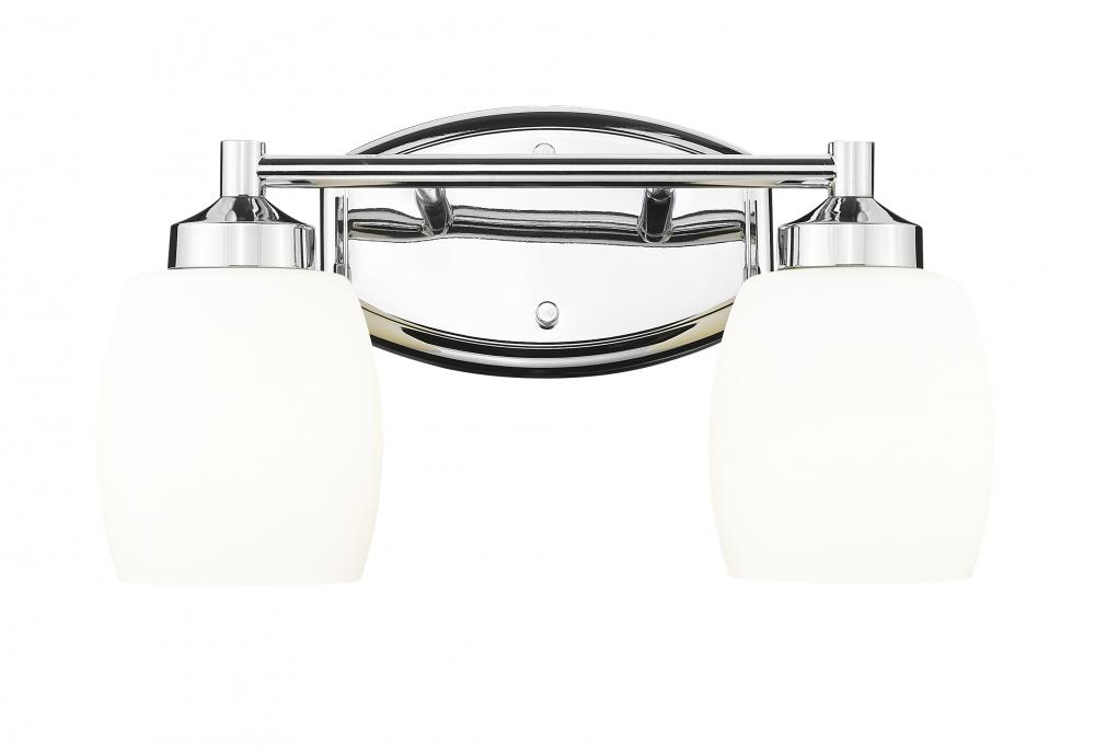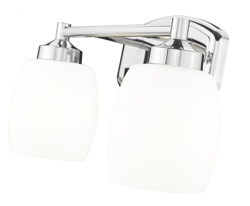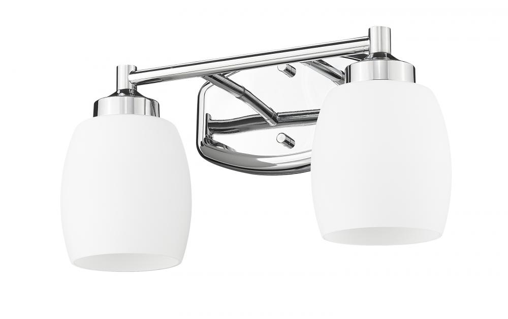 Infuse your bath with the soft illumination and graceful design of a modern two-light vanity fixture. Matte opal glass with chic curvature is complemented with a chrome finish wall plate with a complementary silhouette, offering a fresh, contemporary look and feel in any setting.