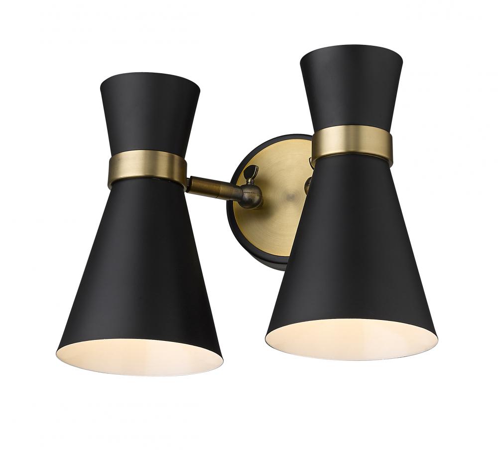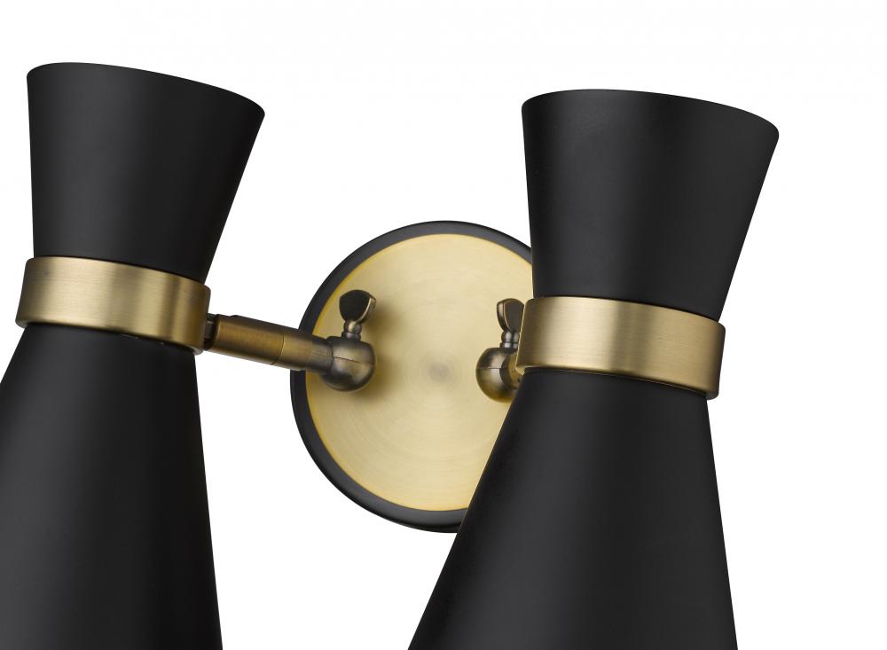 A decorative twin silhouette shapes industrial influence that adds casual elegance to this matte black finish steel two-light wall sconce. Dress up a bathroom or hallway with this tasteful fixture trimmed with heritage brass finish steel. This dual sconce works perfectly as a bath light over a compact vanity.