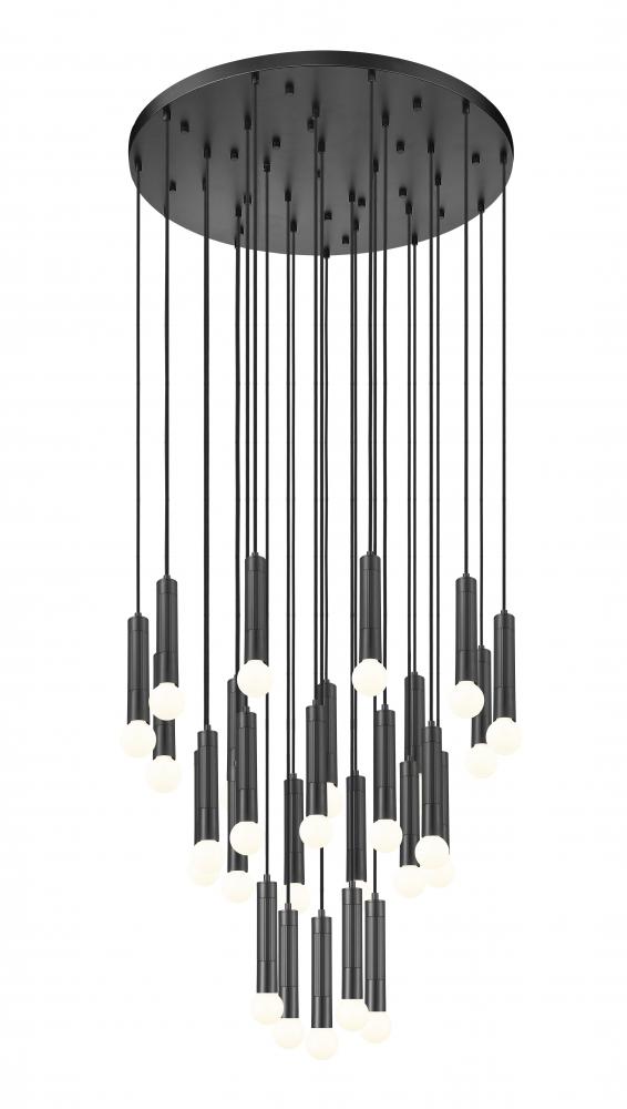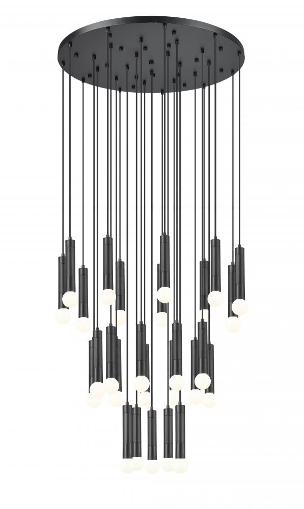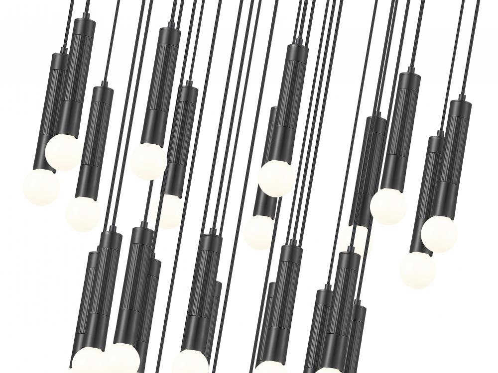 Cool and crisp, this modern 27-light chandelier benefits from the bold contrast and distinctive simplicity of a matte black finish. Its round canopy and braided cords host elongated tubes that bring depth and detail to the design, while petite lights cast inviting illumination. Its a beautiful display of modern minimalism that sets the tone over a grand foyer or beautiful dining table.
