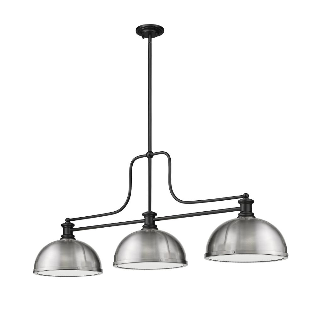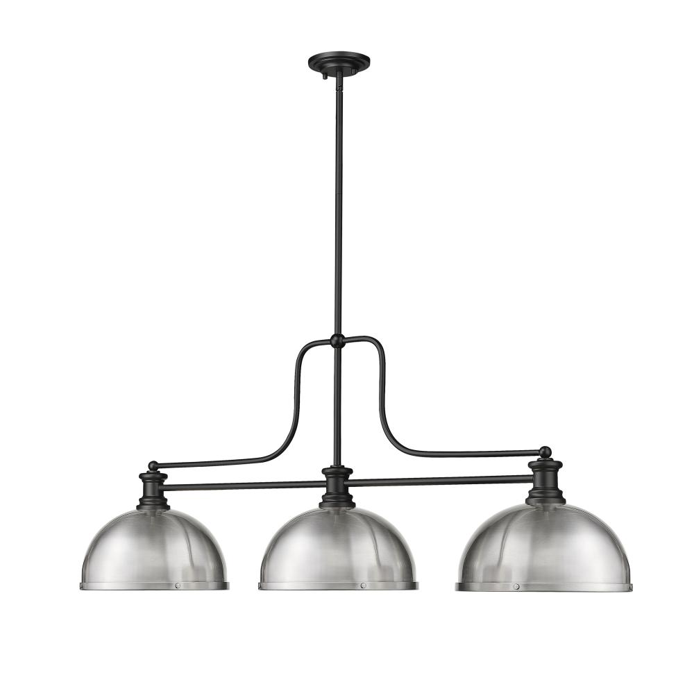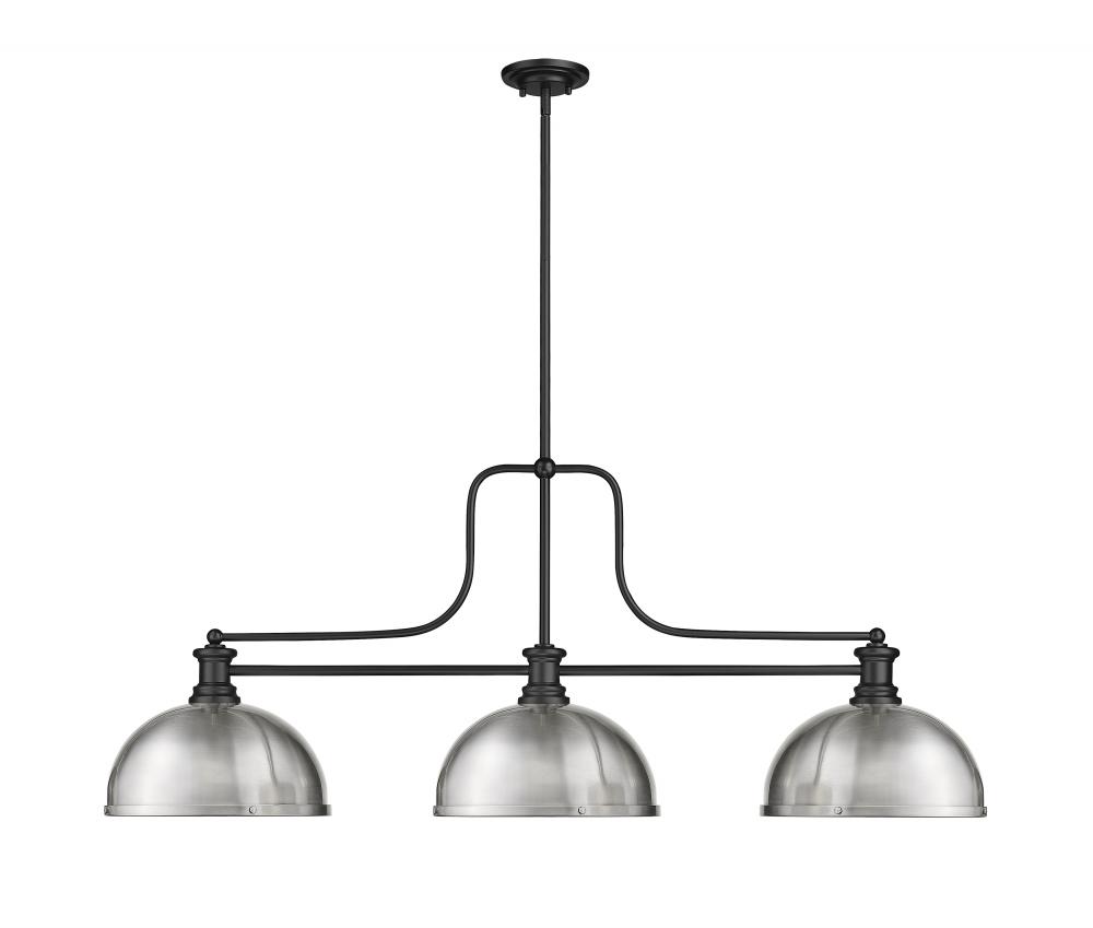 A subtle industrial vibe and brushed nickel and matte black finish pairing flatter this three-light billiards pendant from the M?lange collection by Z-Lite. A simple yet fluid silhouette blends matte black steel and dome-shaped brushed nickel steel shades forming a perfectly balanced profile. This charming fixture is an ideal solution to brighten a kitchen island or sports room billiard space.