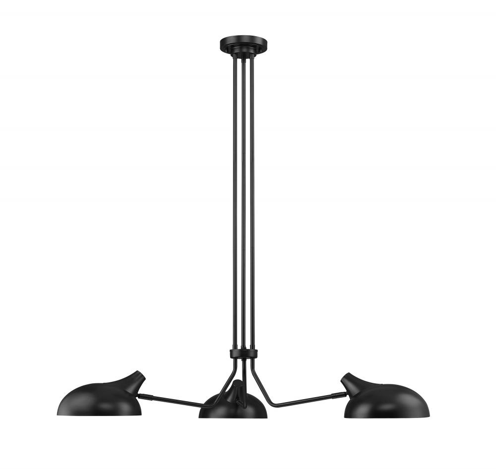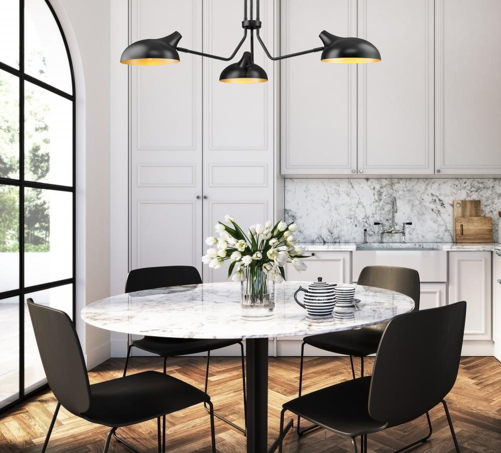 Choose a playful personality to infuse artful charm into lighting with a flexible Mid-Century Modern inspired three-light pendant light. This light from the Bellamy collection delivers on a retro motif with a whimsical angled design positioning black steel shades and rods that spread out ambient and accent illumination over a kitchen island or entertaining space. Lush gold finishes in the shades? interiors add a dose of glam to a simple yet stylish light.