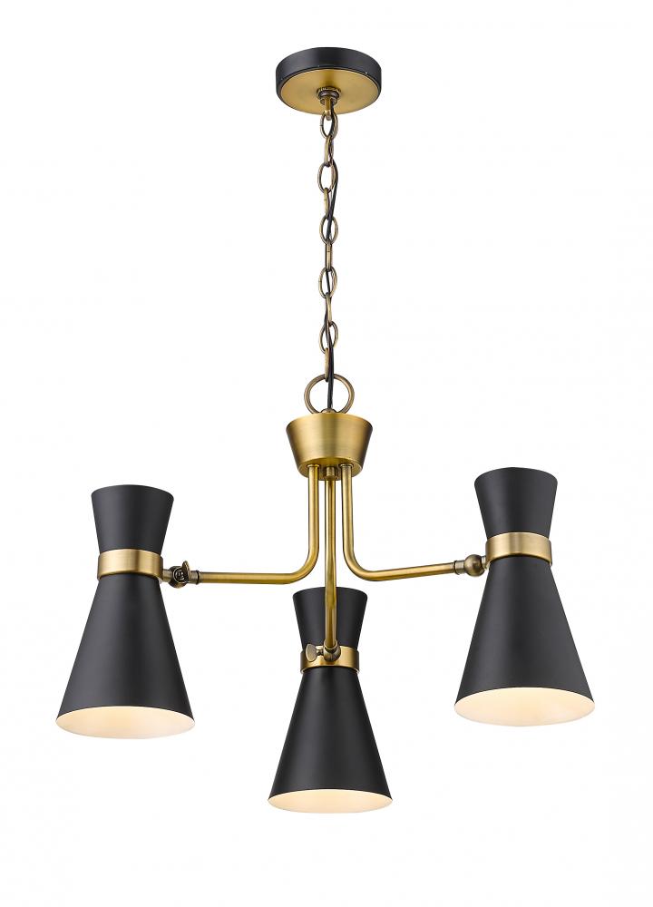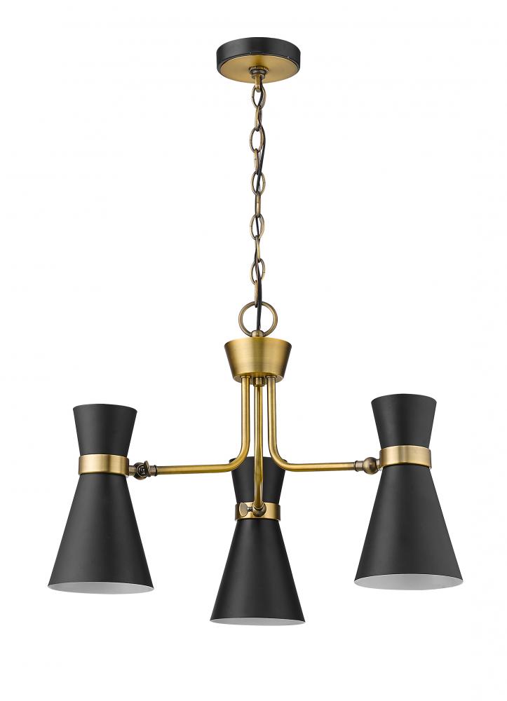 A decorative triplet silhouette shapes industrial influence that adds casual elegance to this matte black finish steel three-light chandelier. Dress up a dining or entertaining space with this tasteful fixture trimmed with heritage brass finish steel. This sleek chandelier captures the heart of romantic industrial charm.