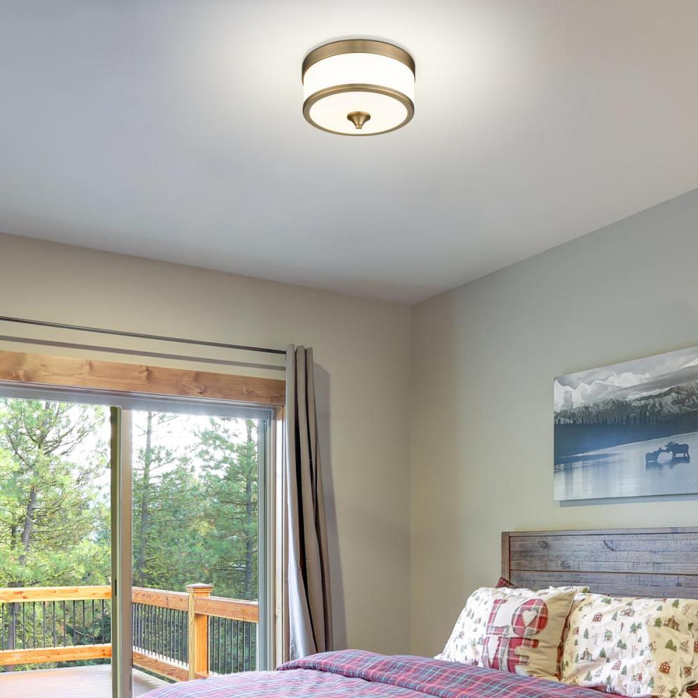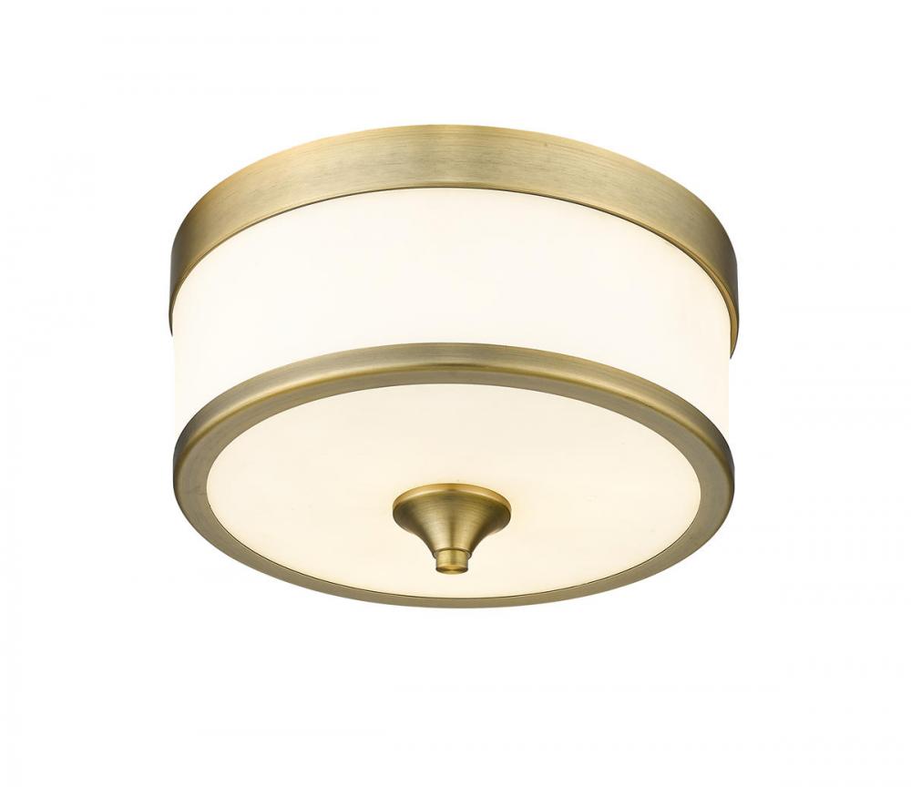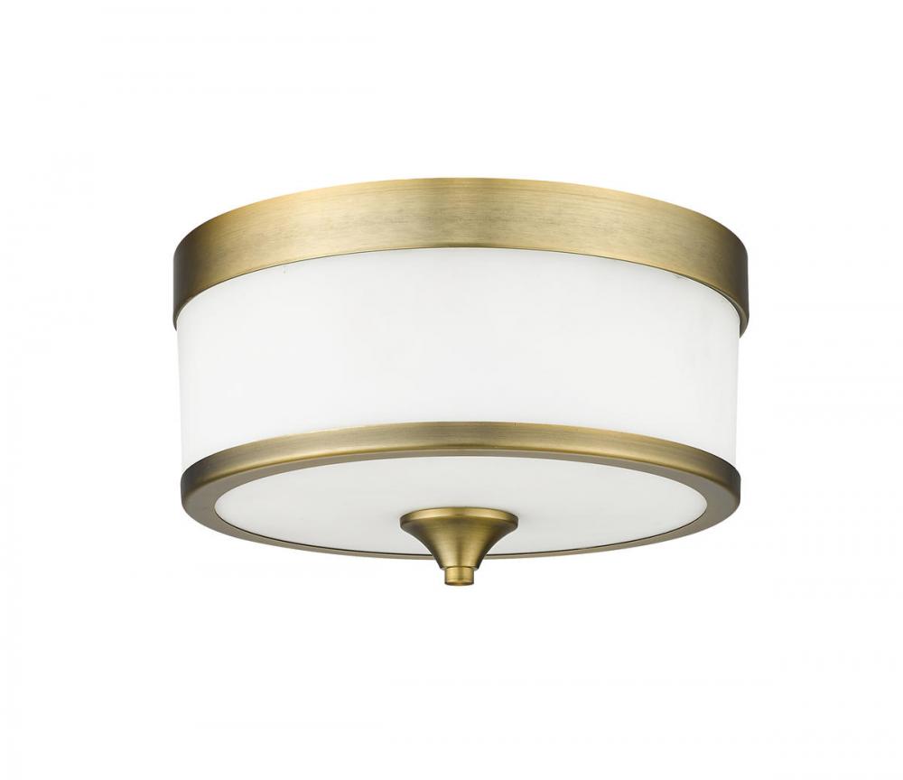 This stylish modern three-light flushmount ceiling light from the Cosmopolitan collection offers a touch of Art Deco flavor, adding simplicity with a twist to a kitchen, dining space, or bedroom. An etched milk white shade is trimmed with heritage brass finish steel bands, creating a slick geometric effect.