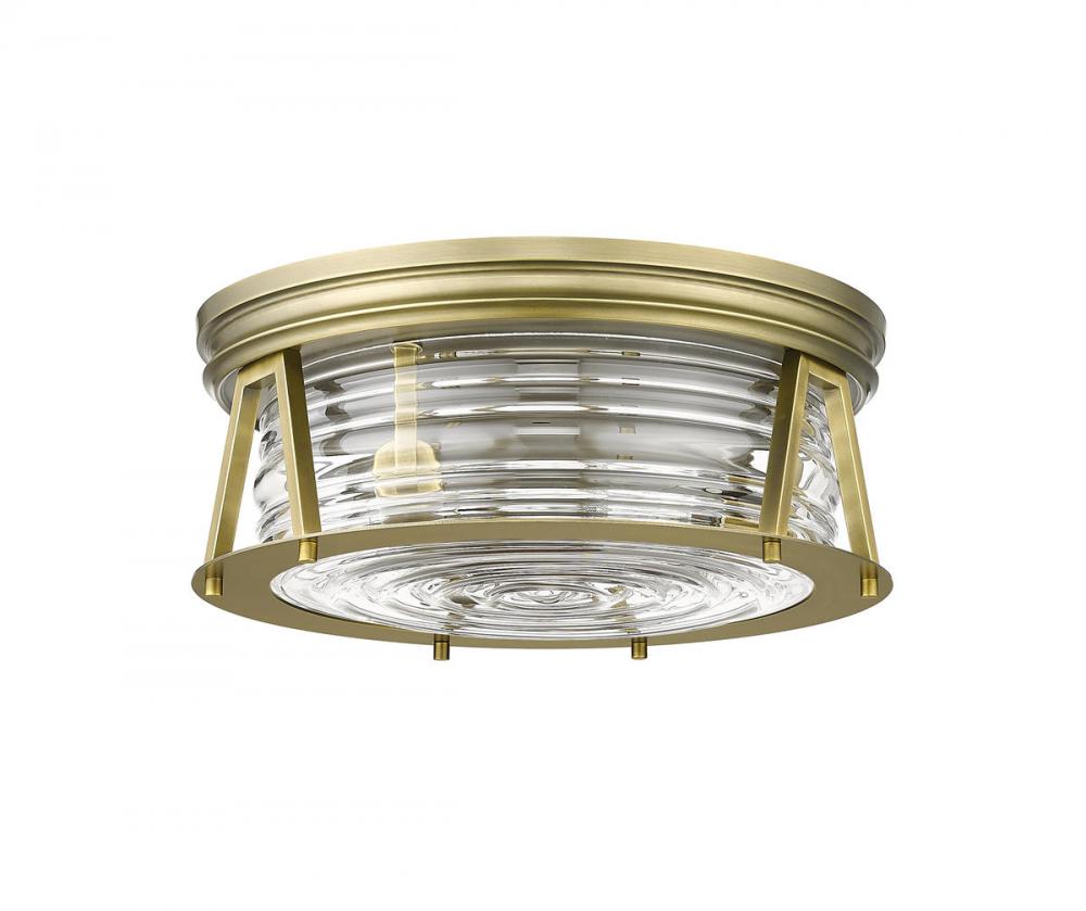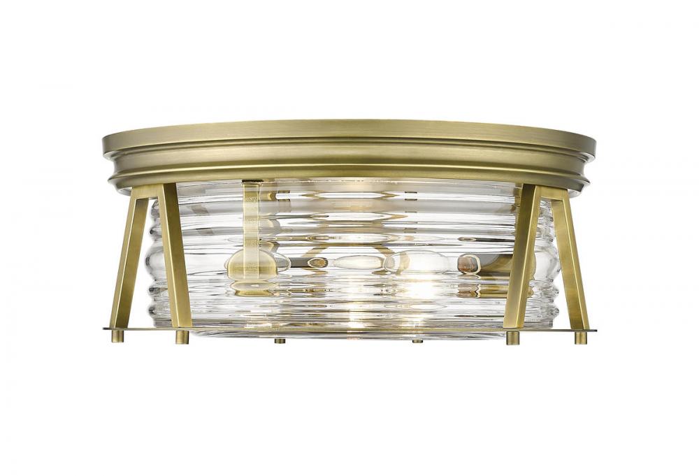 Chic lighting illuminates a custom space with decadence and a hint of nautical fare, customizing this brass and glass three-light flushmount ceiling light. Embrace a historical theme originating from storied lighthouse designs with this light from the Cape Harbor collection, enjoying versatility that embellishes a space with modern, industrial, and Art Deco ambiance. This light offers a sleek ribbed clear glass shade nestled in a linear frame fashioned of warm rubbed brass finish steel.