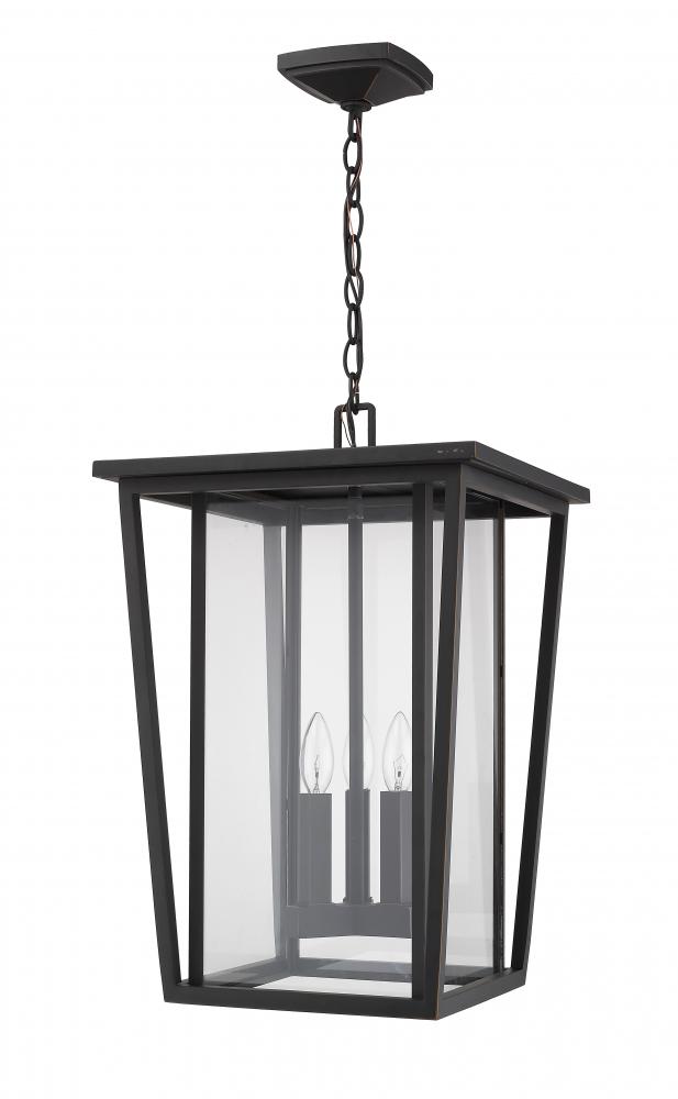 Offer proper lighting to guests in an outdoor setting with this tasteful hanging lantern. Clear glass offers a delightful contrast to a frame with a warm rubbed bronze finish.