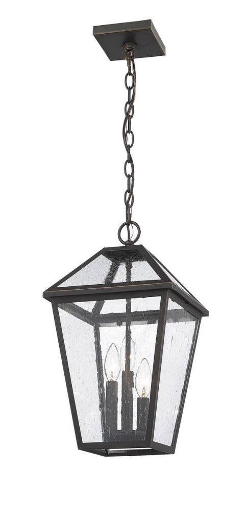Illuminate an exterior front or back yard space with a classic fixture reflecting a charming village theme. Made from Rubbed Bronze metal and seeded glass panels, this three-light outdoor chain mount ceiling light brings a design-forward look to wrap up a tasteful and functional patio or porch space.