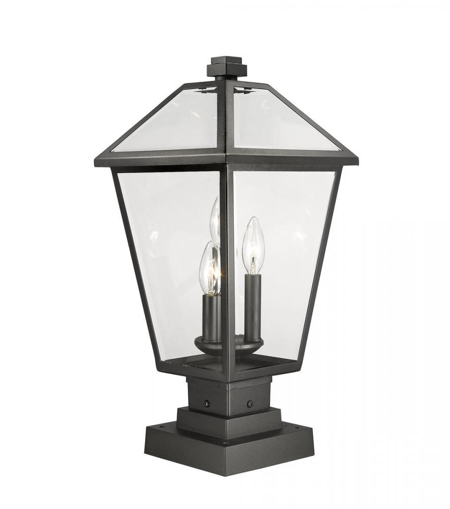Illuminate an exterior front or back walkway with a classic fixture reflecting a charming village theme. Made from Midnight Black metal and clear beveled glass panels, this three-light outdoor pier mounted fixture delivers a charming upgrade with industrial-inspired attitude and a layered silhouette thats perfect for lower-level gardens and walkways.