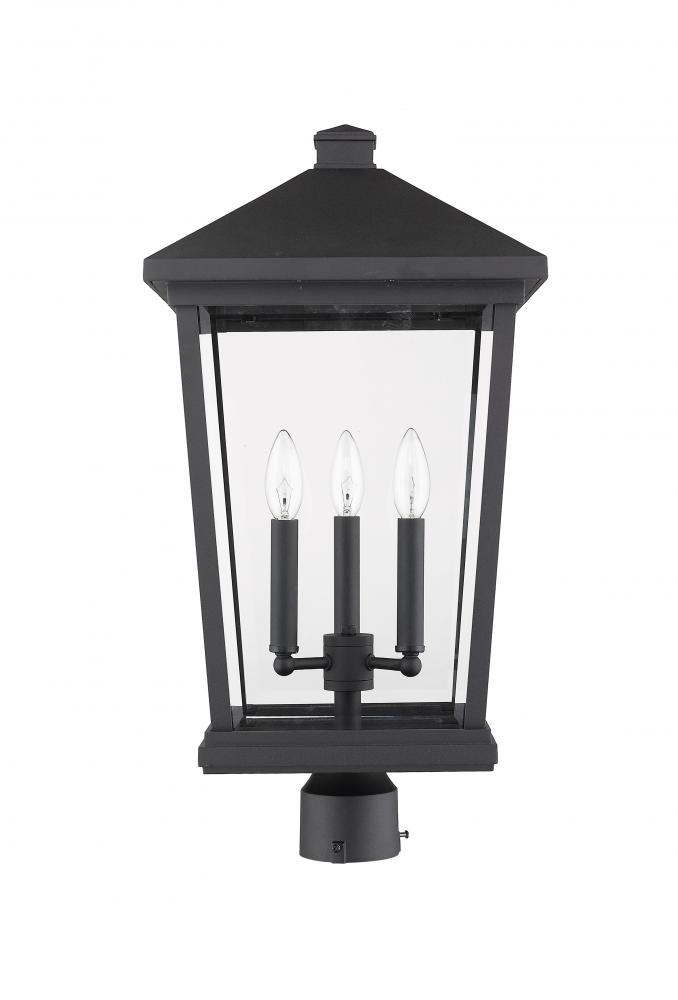 This small outdoor post lantern is ideal for illuminating a compact exterior space. With a black finish frame and clear beveled glass, it creates a charming village theme that embellishes custom design schemes.