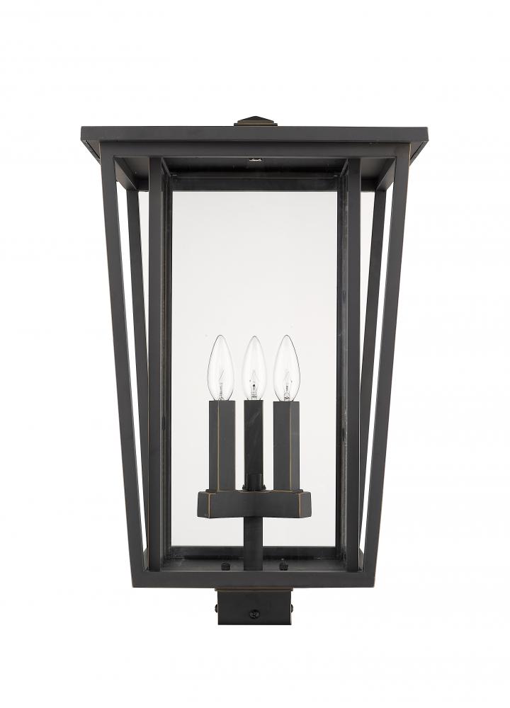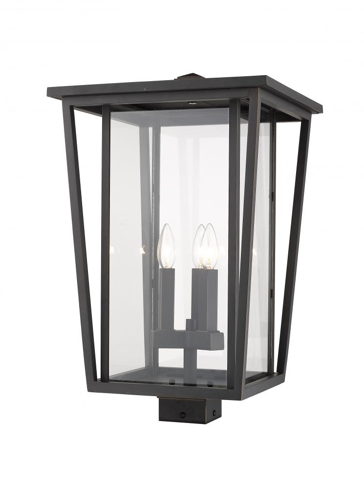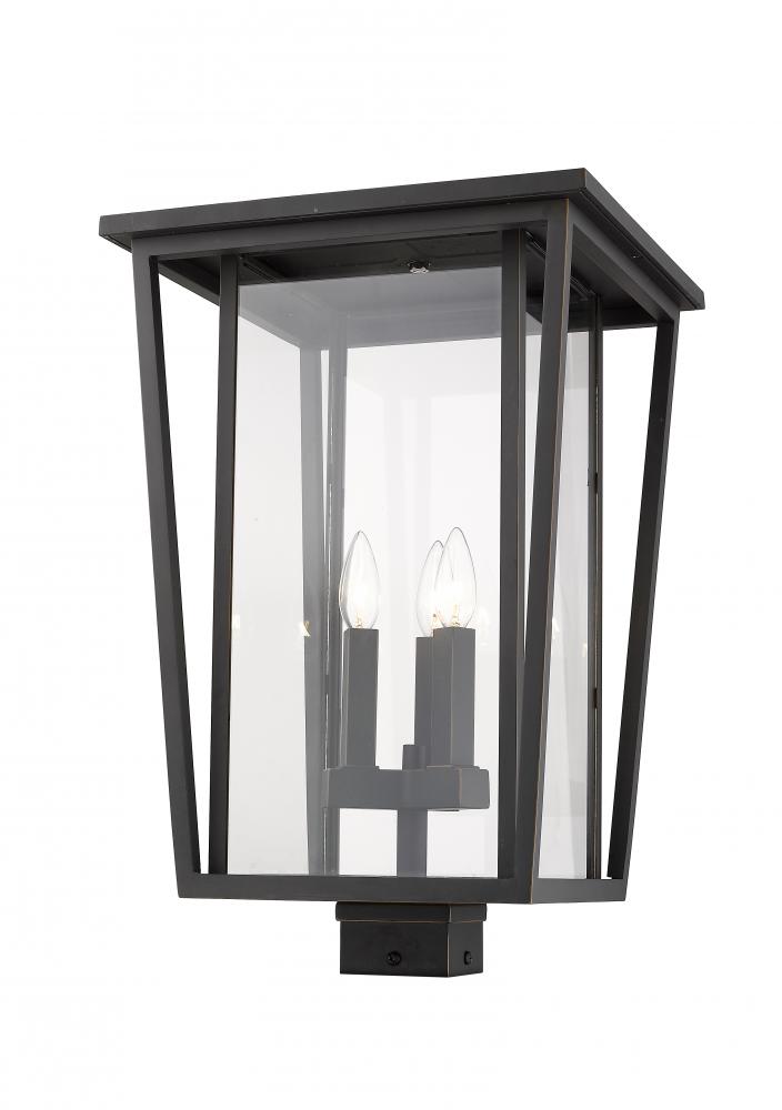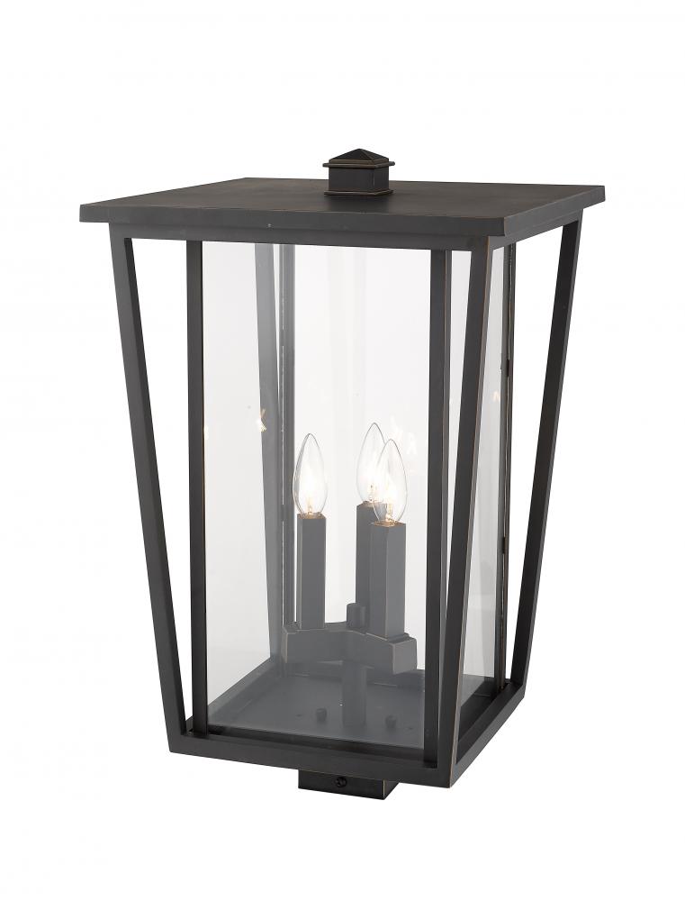 Pour on the charm as you plan lighting for a custom front or back yard. This rubbed bronze finish post lantern blends linear, geometric character with the charming look of candelabra-style bulb bases visible behind pristine clear glass.
