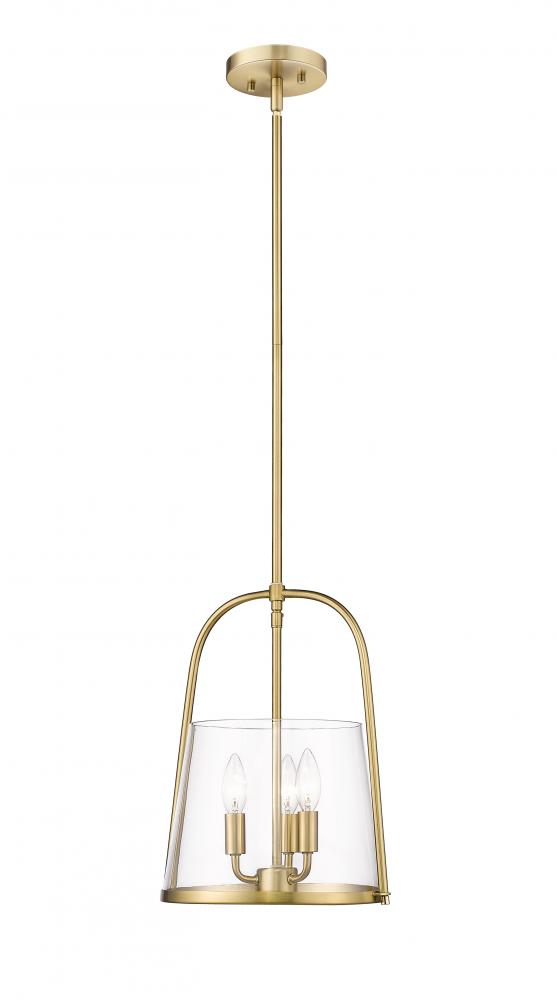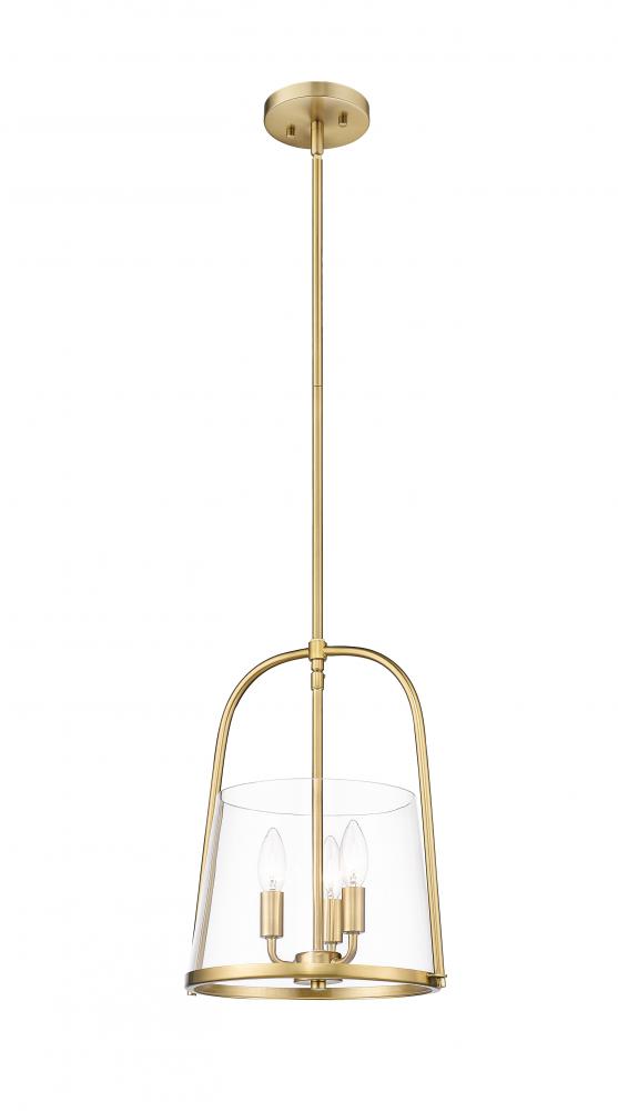 A bit of nautical charm and a decadent mix of materials complement this three-light pendant from the Archis collection, delivering transitional style elements perfect for any space. Framing of modern gold finish steel emulates an open bell silhouette with a romantic clear glass shade positioned at its bottom. Candelabra lamping changes up the mood with a softening effect, making this pendant a superb option for a trending minimalist modern or transitional setting.