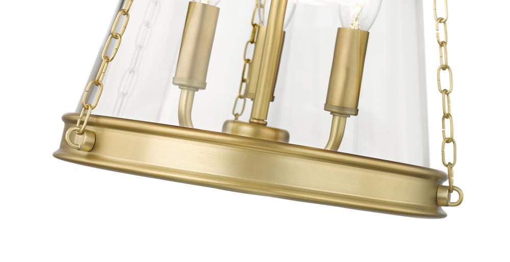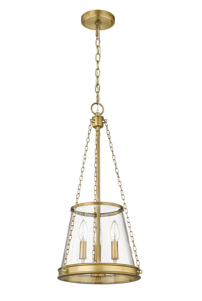 This petite three-light pendant creates a breathtaking urban touch to kitchen islands and foyers. A modern take on classical design, a charming three-arm candelabra style light rests inside a clear glass shade that elegantly tapers toward the top, transitioning into industrial style chain link supports. Lending a contemporary feel to this transitional three-light pendant is a warm rubbed brass finish that boasts a chic, luxe metallic element.